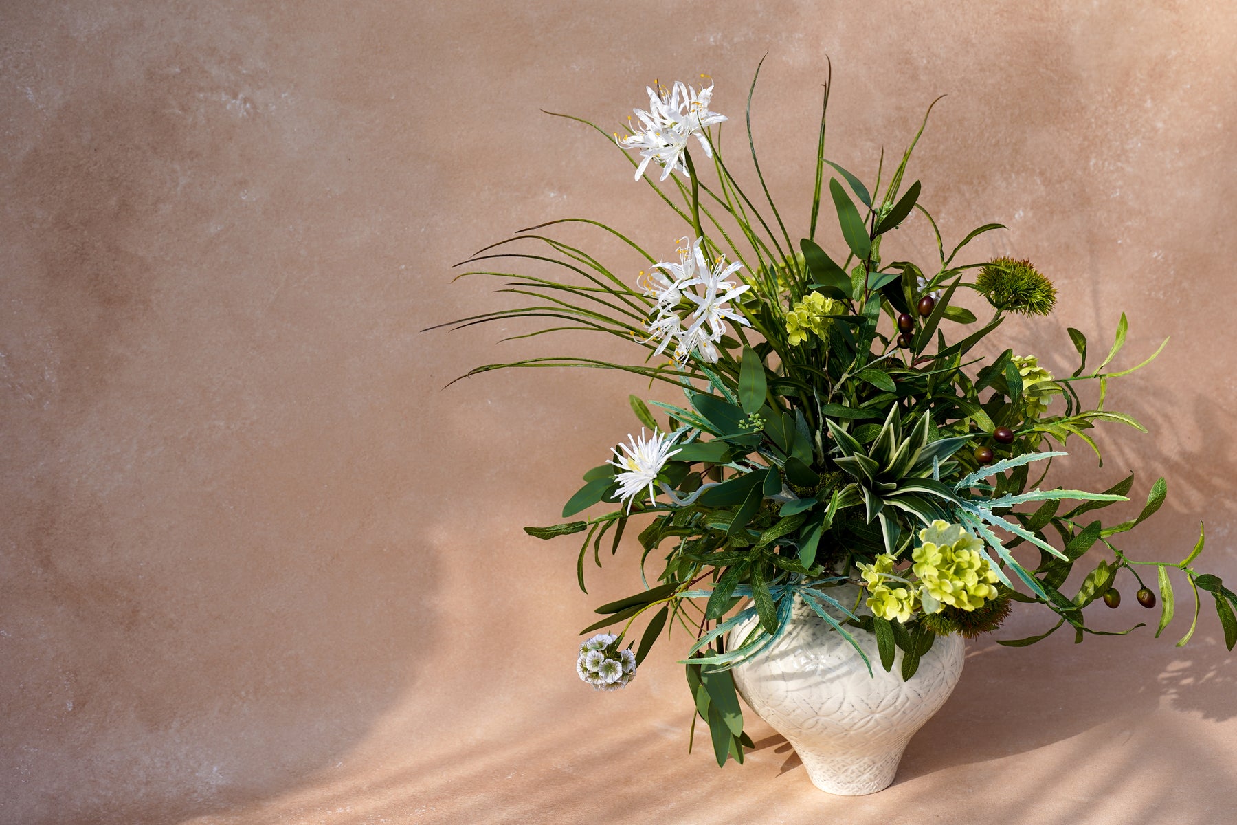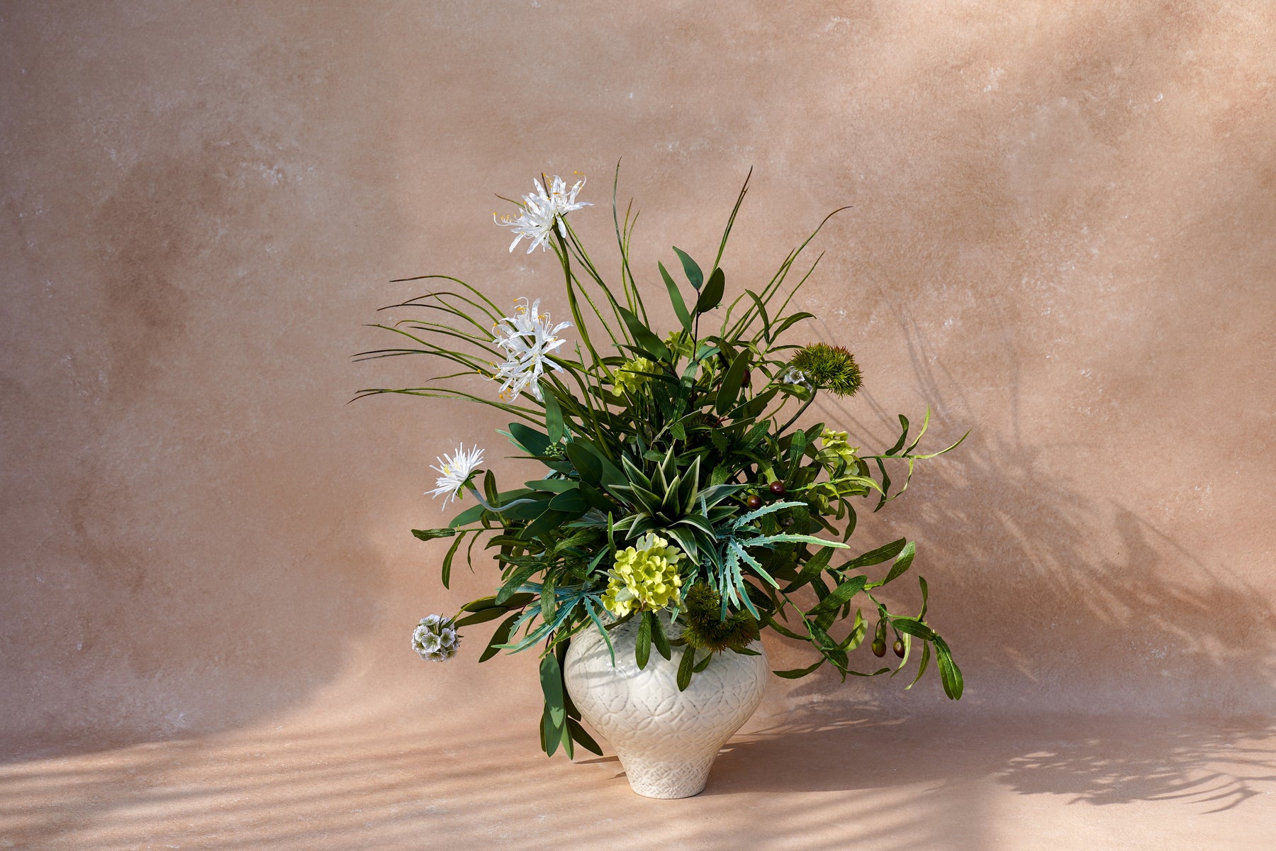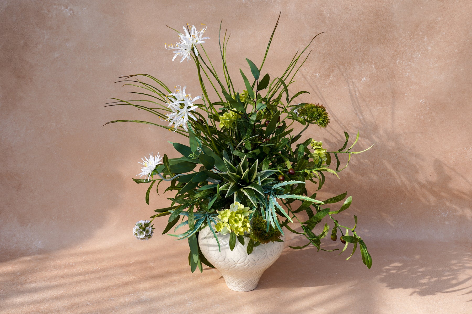 A layered mix of crisp greens and soft ivory creates a clean, modern look. Wispy white spider blooms float above sculptural foliage, with chartreuse accents and berry-like details adding depth. A variegated, succulent-style center gives the design a contemporary edge, while flowing greenery extends outward for movement and a “styled, not stuffed” silhouette.