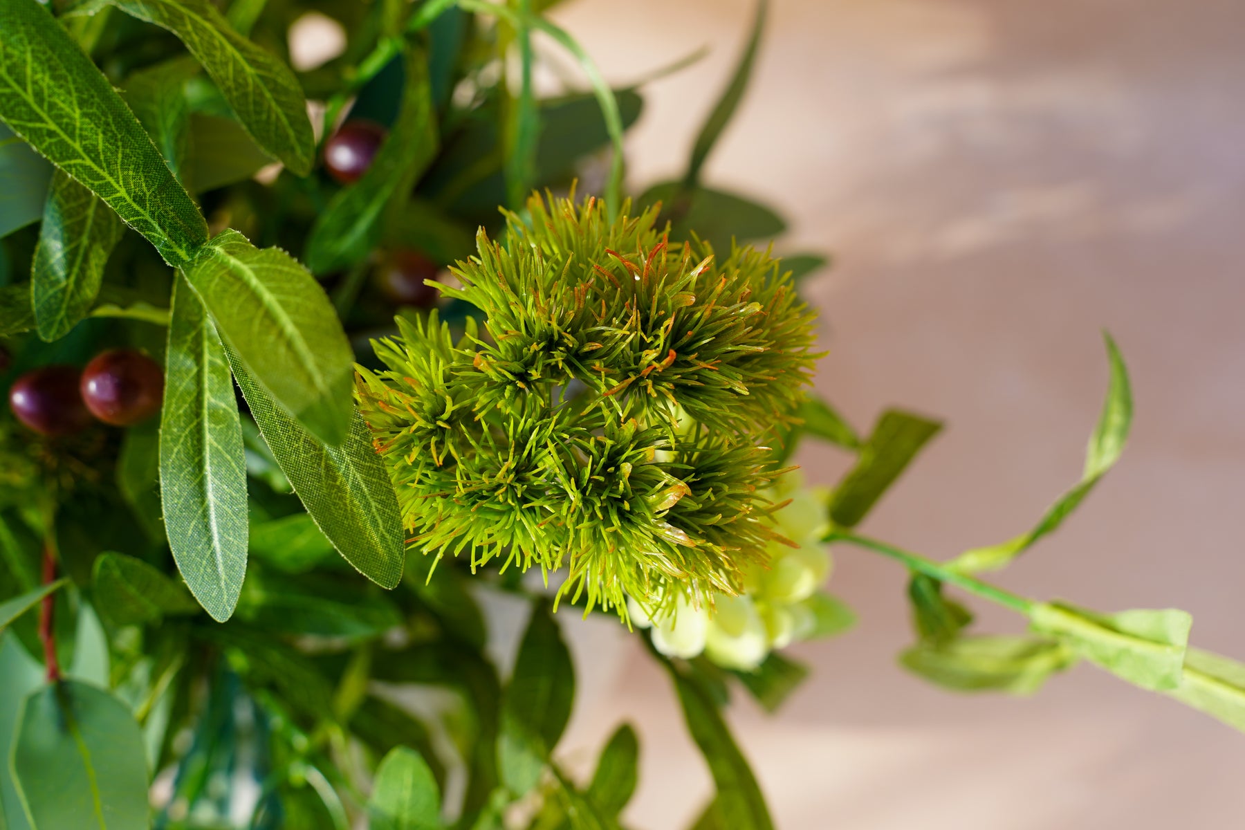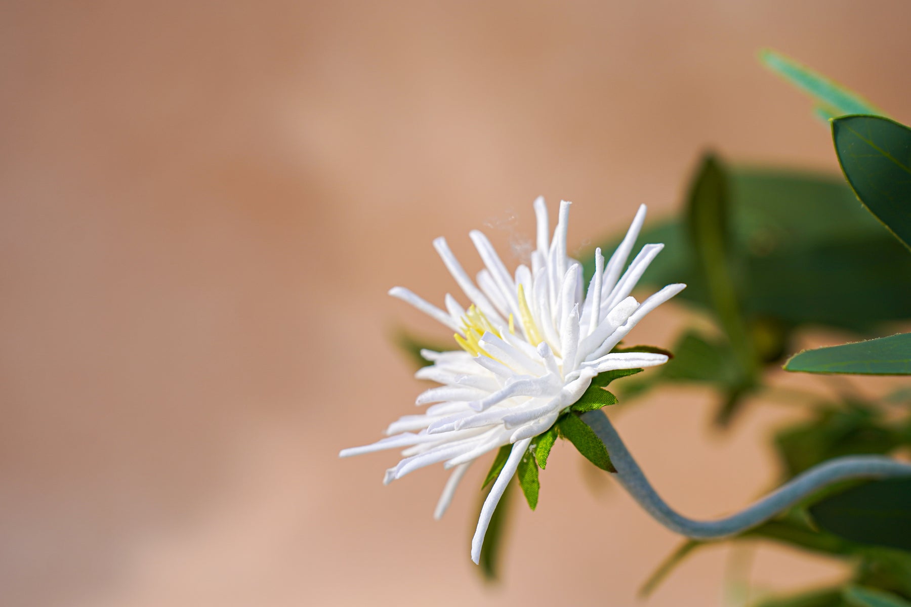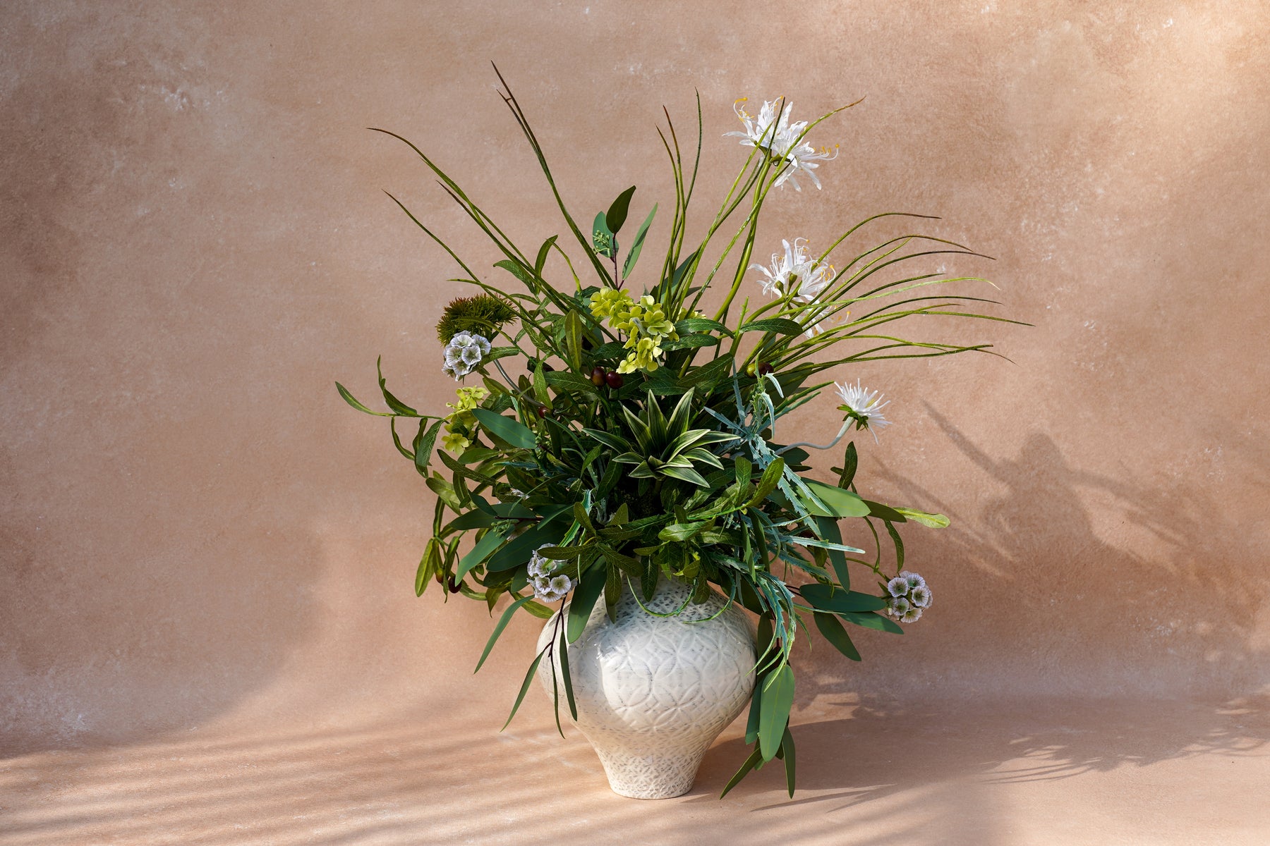 A layered mix of crisp greens and soft ivory creates a clean, modern look. Wispy white spider blooms float above sculptural foliage, with chartreuse accents and berry-like details adding depth. A variegated, succulent-style center gives the design a contemporary edge, while flowing greenery extends outward for movement and a “styled, not stuffed” silhouette.