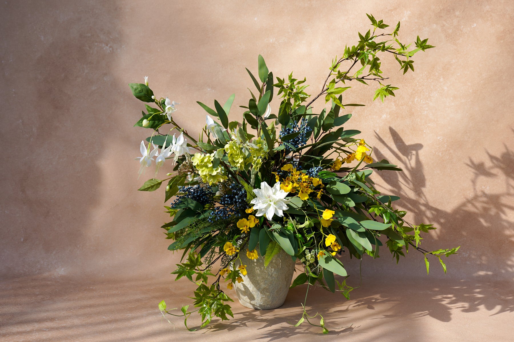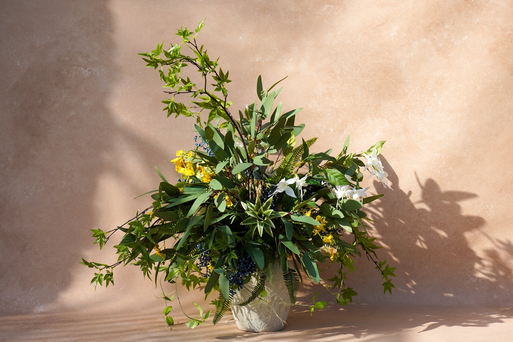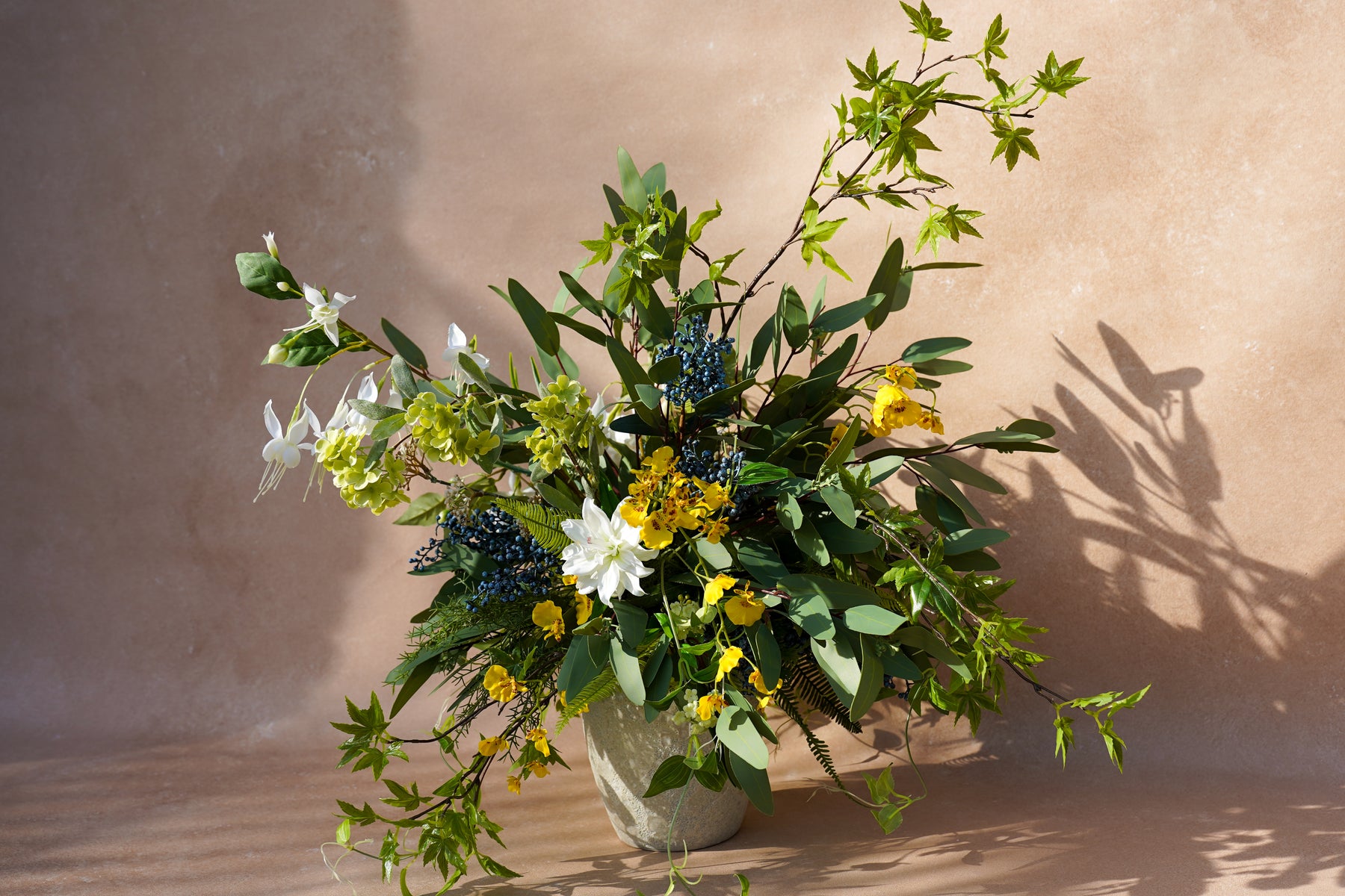 This all-green composition is layered and intentional, mixing soft chartreuse clusters, wispy white spider blooms, and sculptural foliage with a sleek succulent-style center. Airy grasses add height, while berry-like accents and trailing greens bring movement and a natural, “just styled” finish—minimal, but never boring.