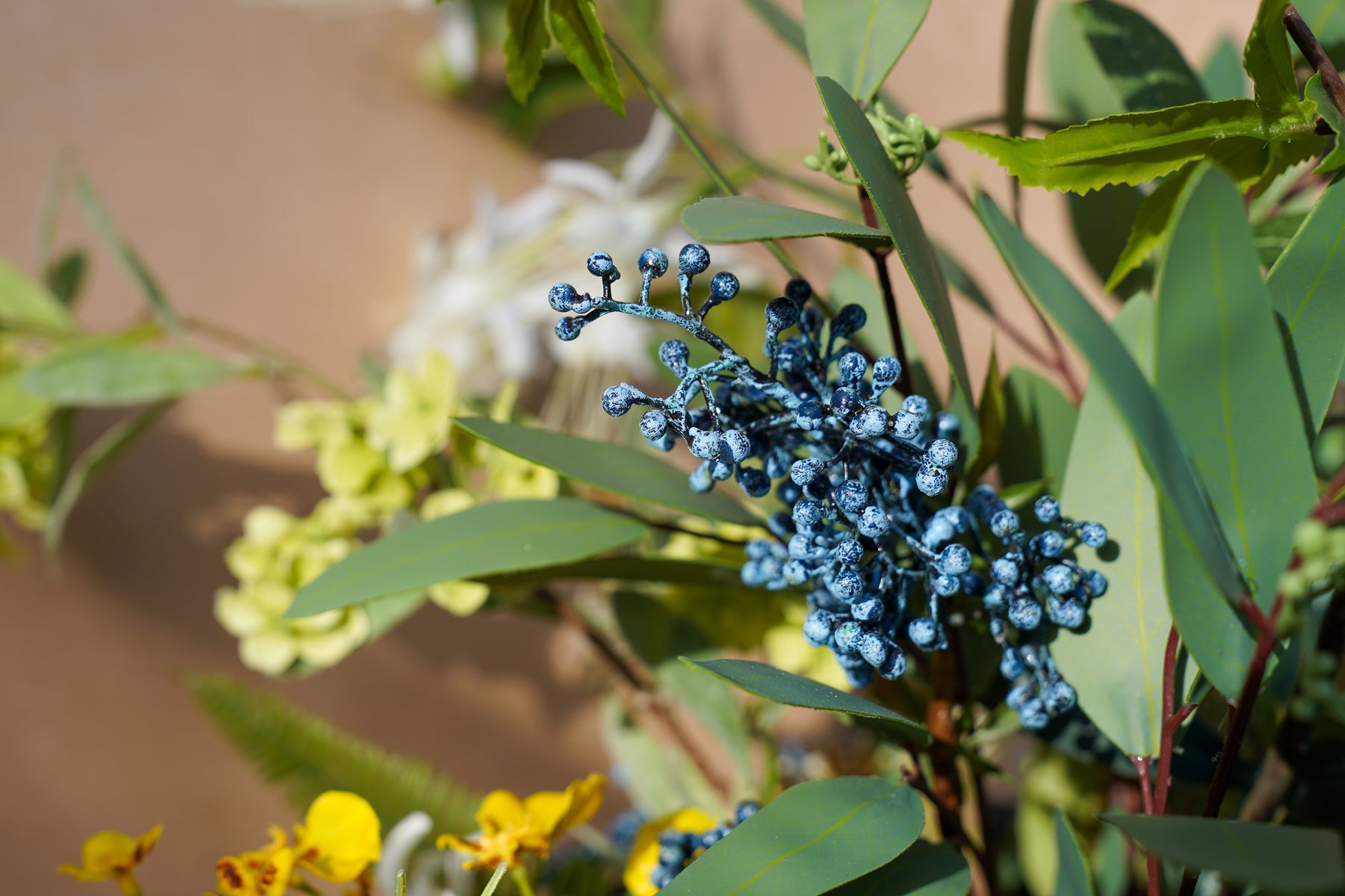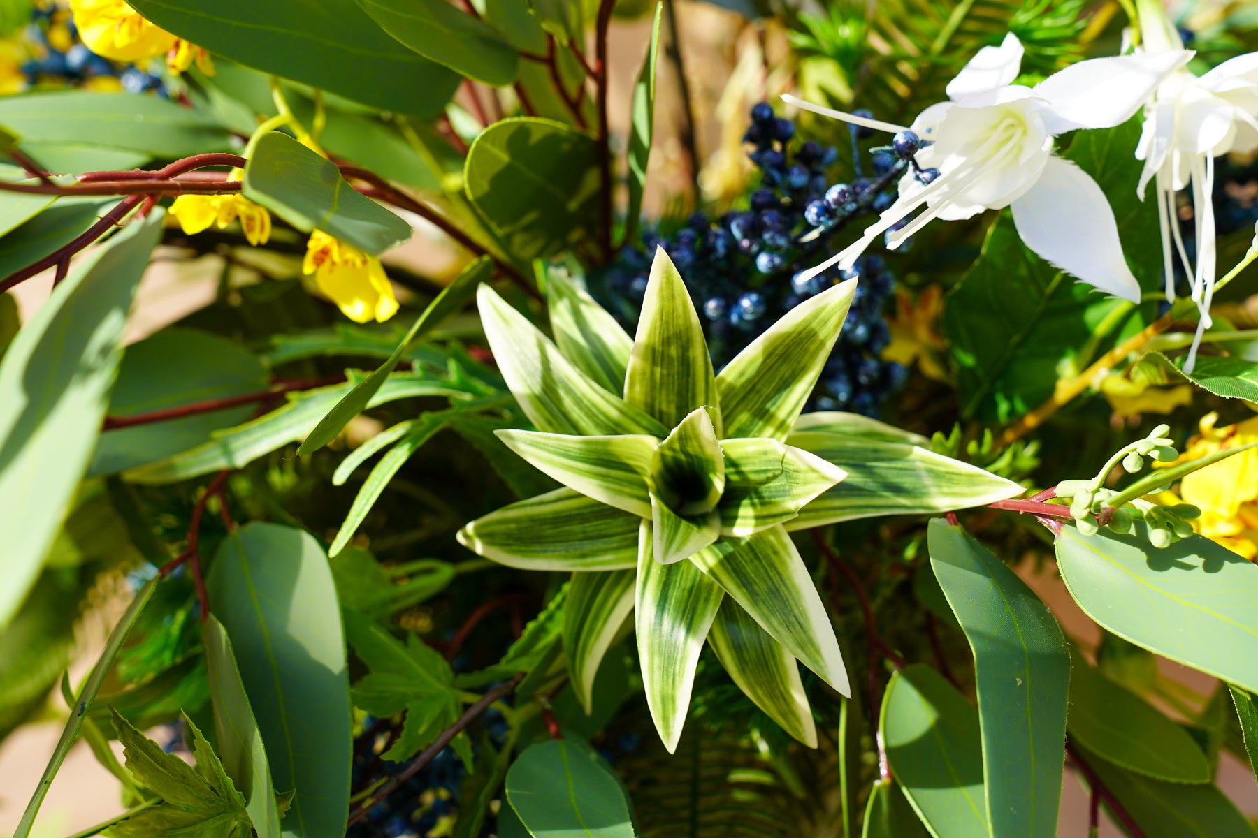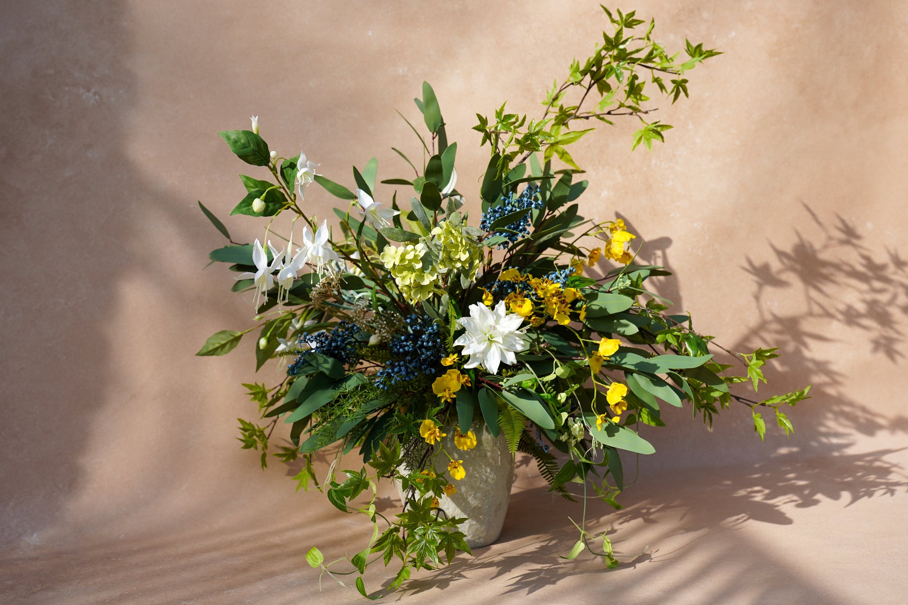This all-green composition is layered and intentional, mixing soft chartreuse clusters, wispy white spider blooms, and sculptural foliage with a sleek succulent-style center. Airy grasses add height, while berry-like accents and trailing greens bring movement and a natural, “just styled” finish—minimal, but never boring.