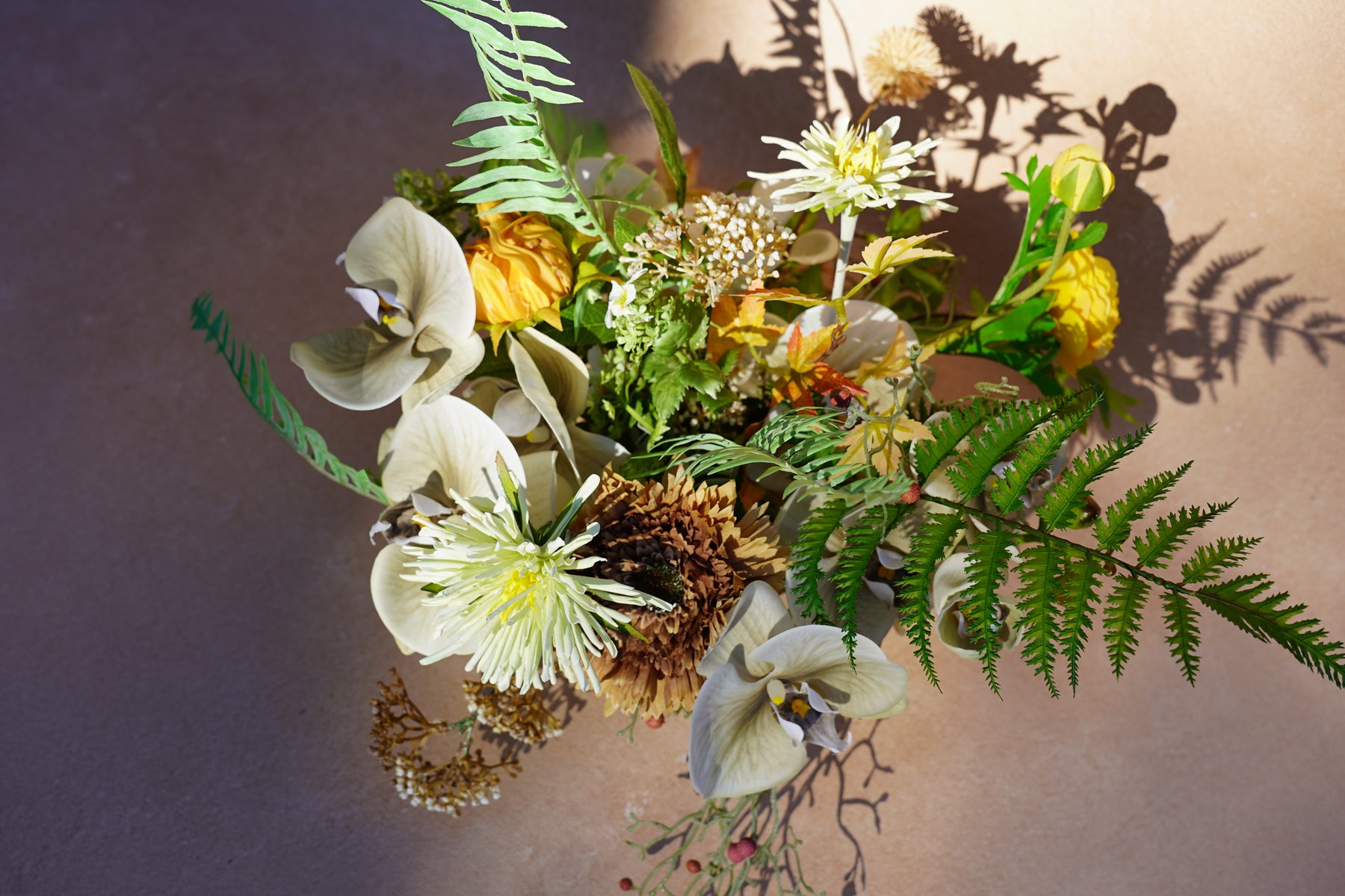 Creamy orchid blooms and crisp white botanicals create a clean, luxe base, warmed with golden ranunculus-style rosettes and delicate buttery buds. Airy fern fronds sweep outward for movement, while tiny berry accents and soft textural elements add depth and that “designer-styled” finish—natural, balanced, and unforgettable.