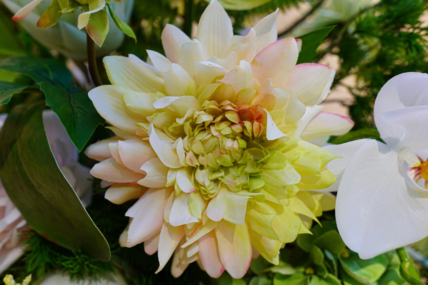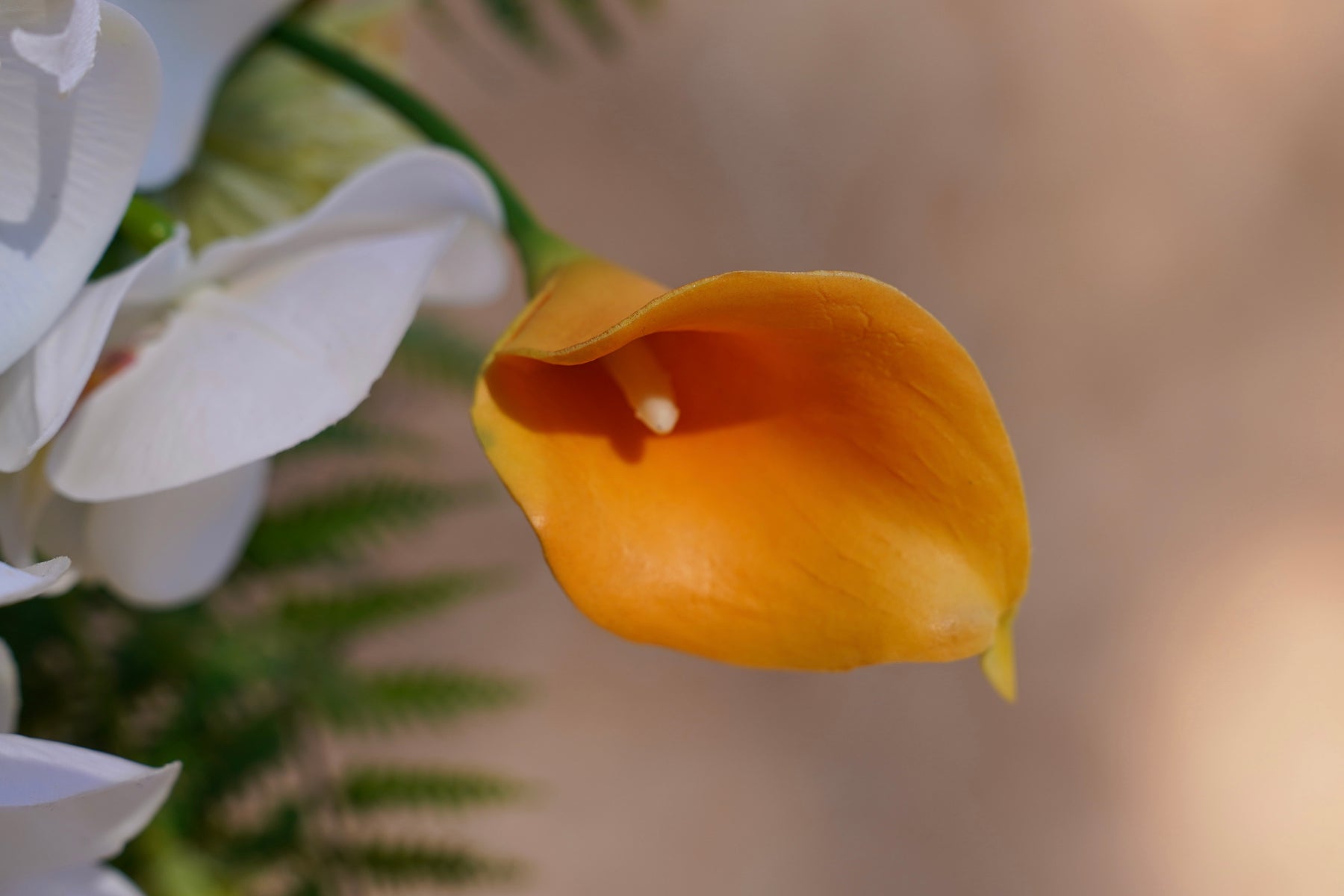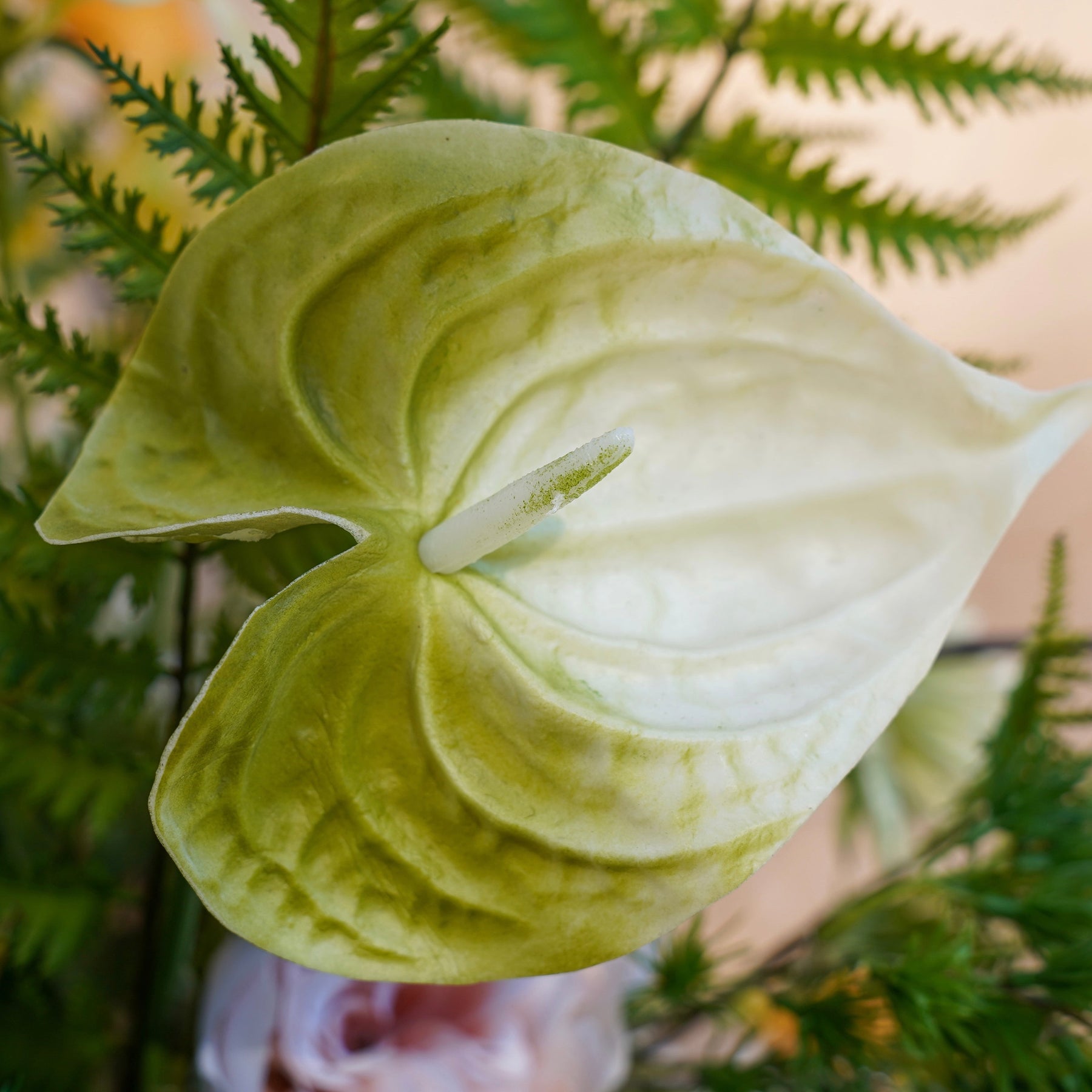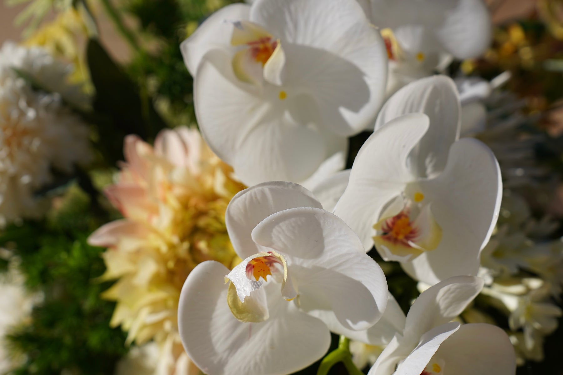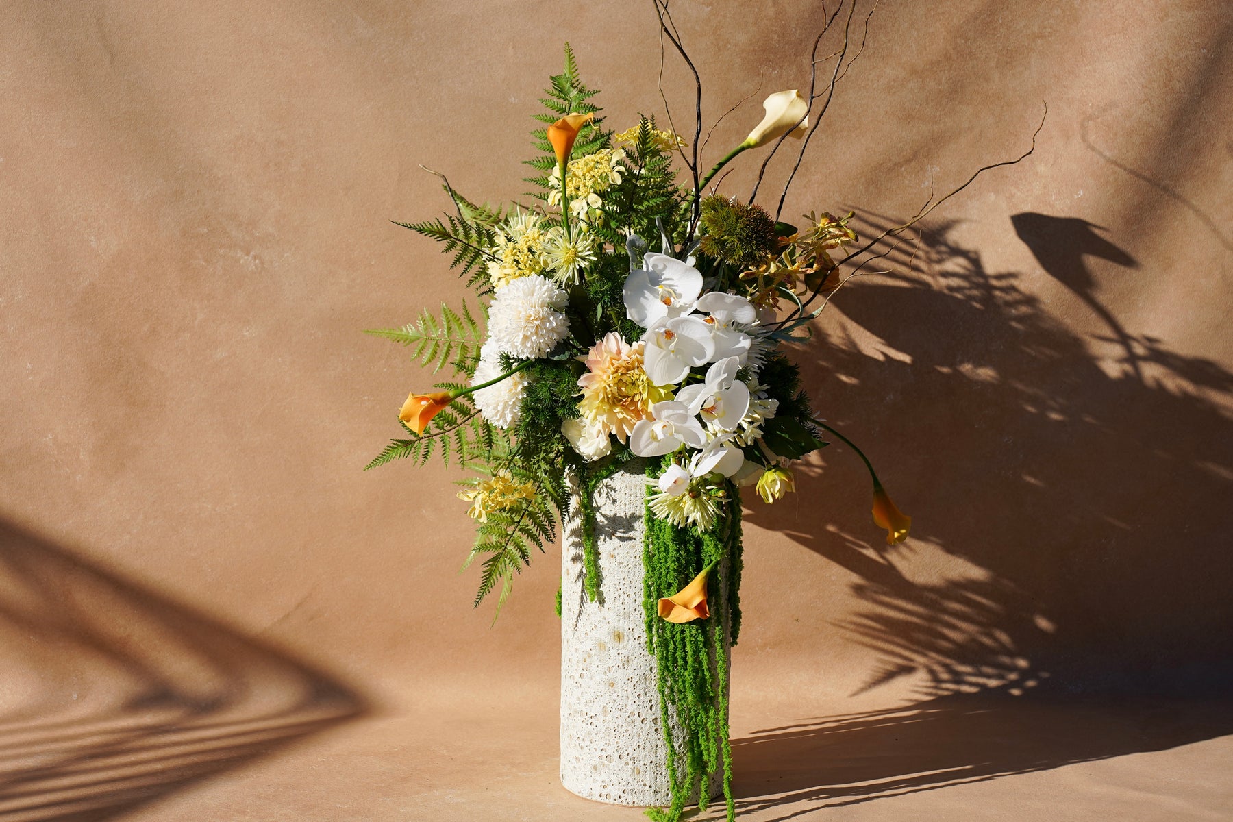 Crisp whites and soft creams set a clean, luxury base, warmed with buttery yellow and apricot accents. Sculptural white orchids take center stage, layered with cloud-like mums, airy spider blooms, and golden botanical sprigs. Fern fronds add lush fullness, while tall, twisting branches create height and a gallery-worthy silhouette. Finished with a dramatic cascade of mossy green for movement and softness.