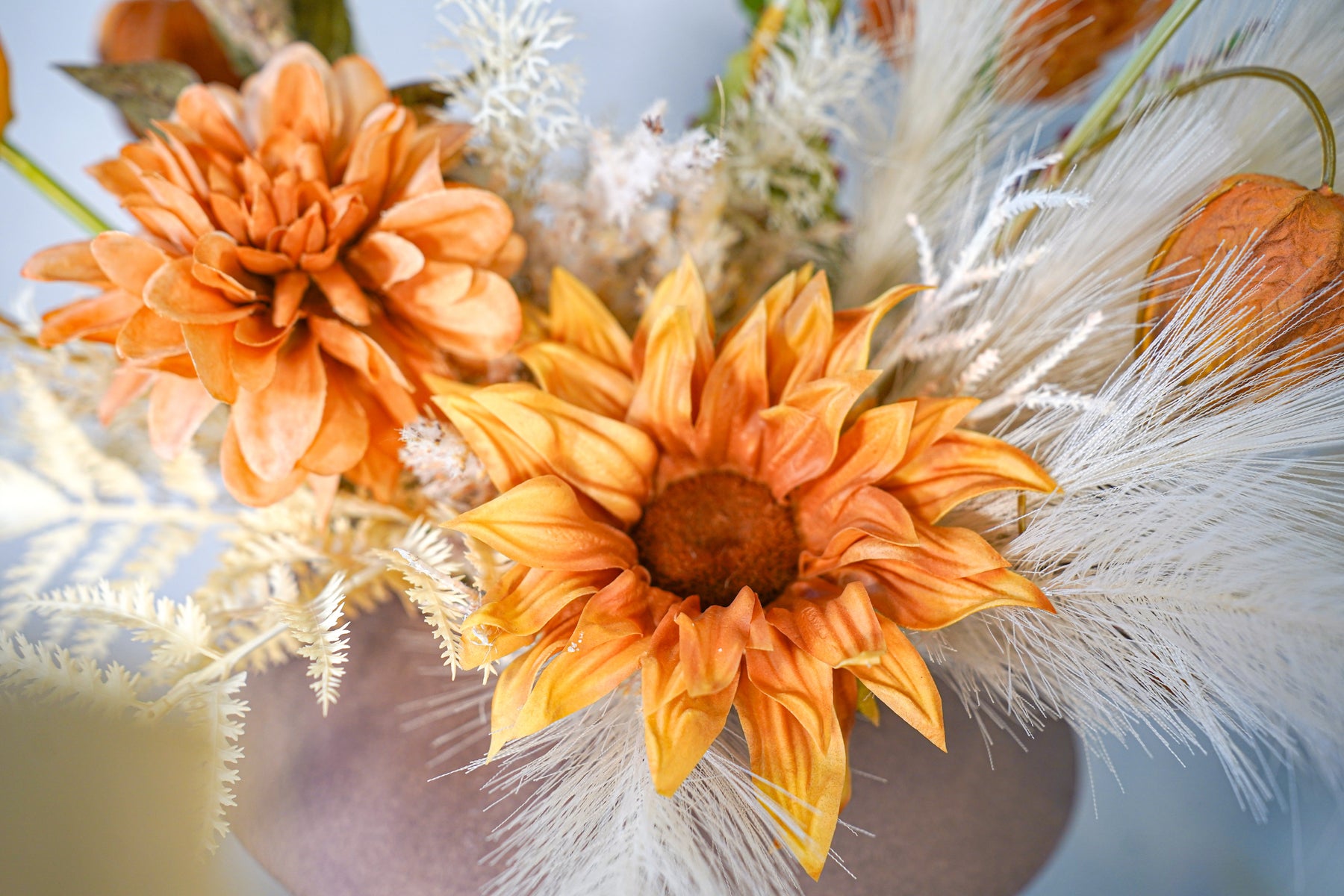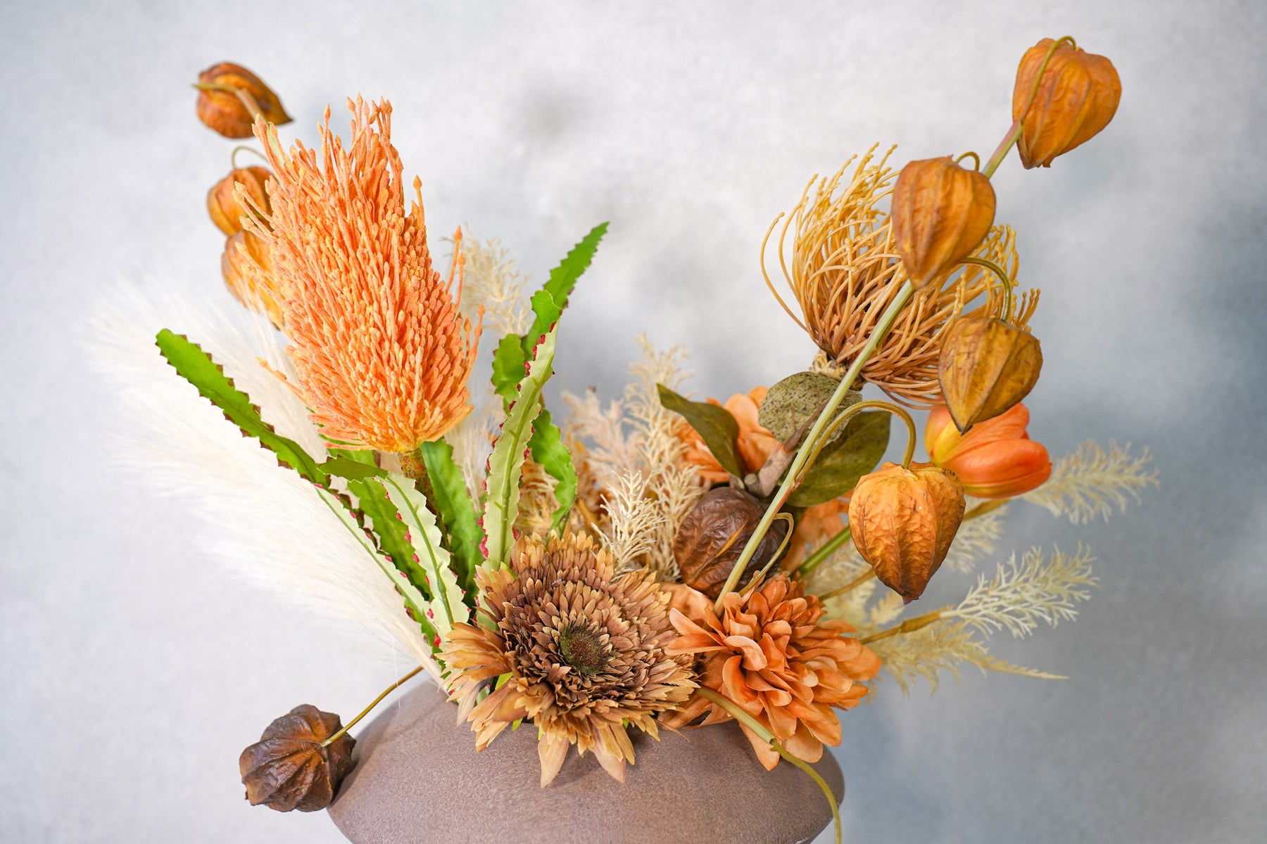 A wabi-sabi, Japandi sand-toned vase grounds the arrangement with natural texture and imperfect beauty—amplifying the sunset mood without stealing attention.