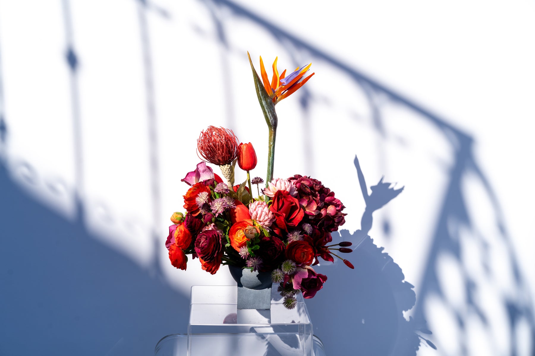 Red leads the story, flowing through sunlit orange into deep burgundy for depth. A sculpted mix of roses, buttercups, and bird of paradise speaks many dialects of love—tender, playful, and bold—arranged in a dynamic, heart-kissed curve.
