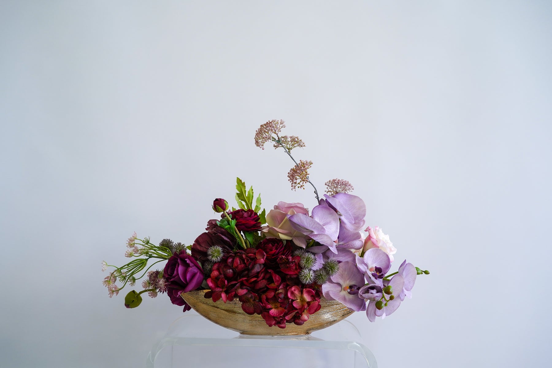 A golden boat vase lifts the design with a gentle, “in-flight” curve—light catching along the rim to echo the arrangement’s graceful motion.