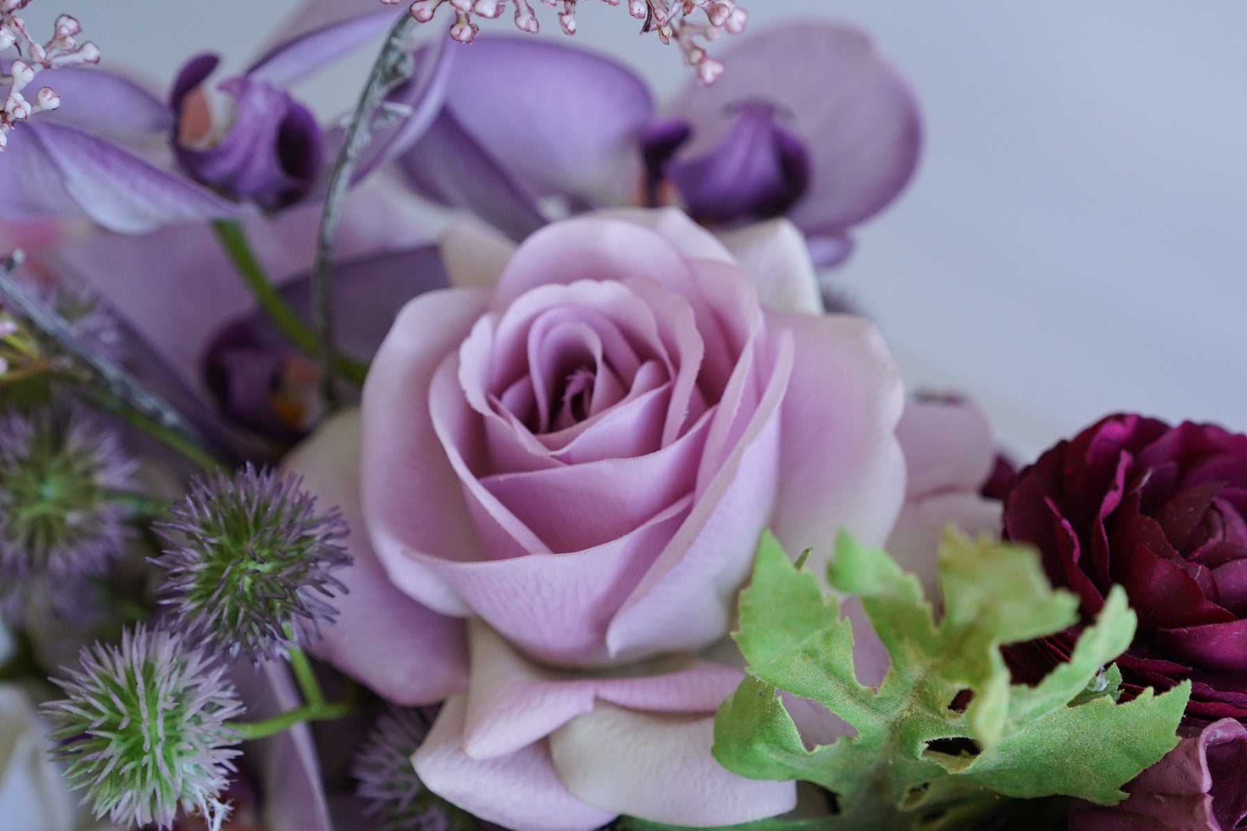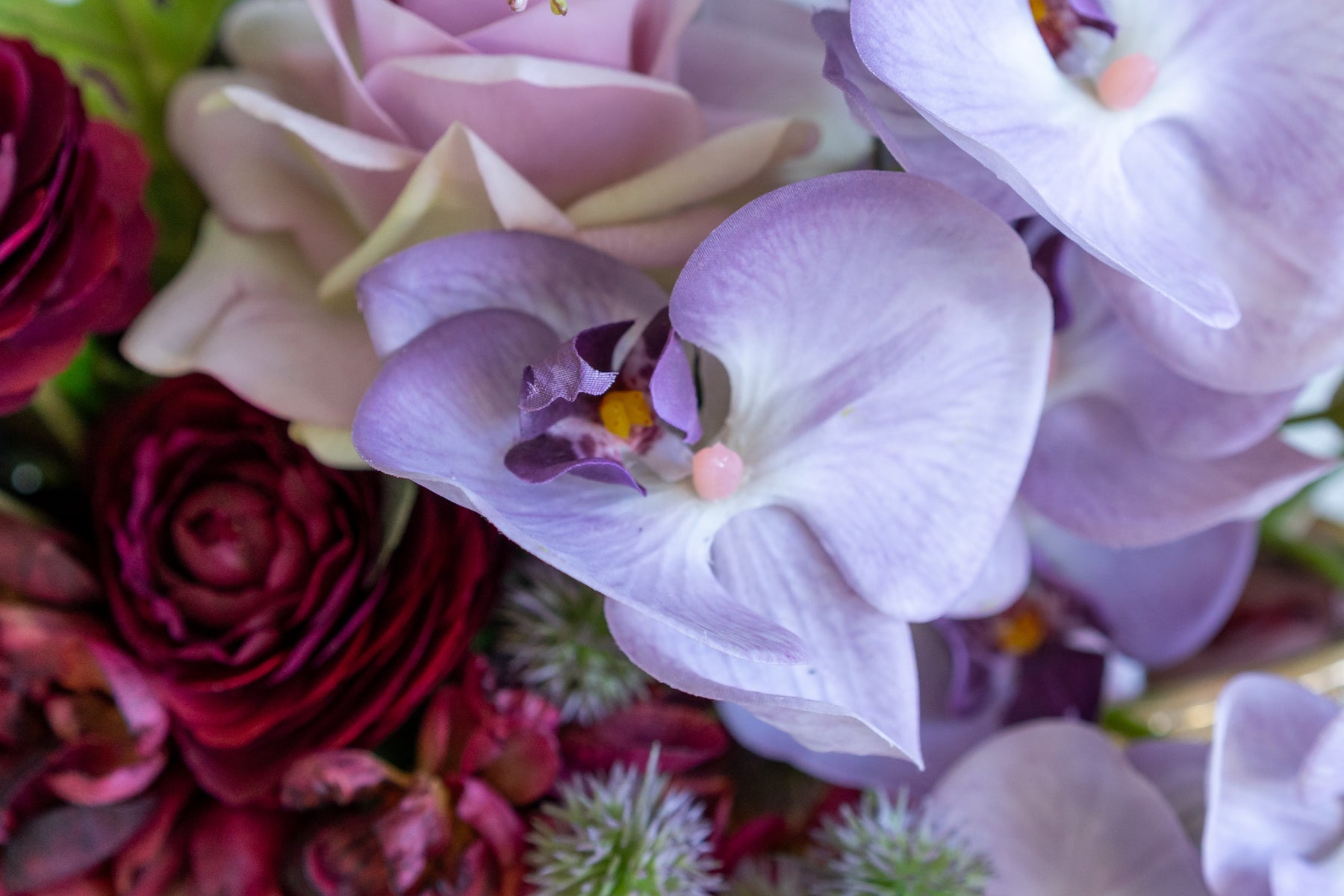 A sculpted harmony of orchids and purple roses, moving from mauve and lilac to plum and aubergine. The full spectrum of purple becomes our love language—soft notes for tenderness, deeper hues for devotion—composed in a flowing, modern silhouette.