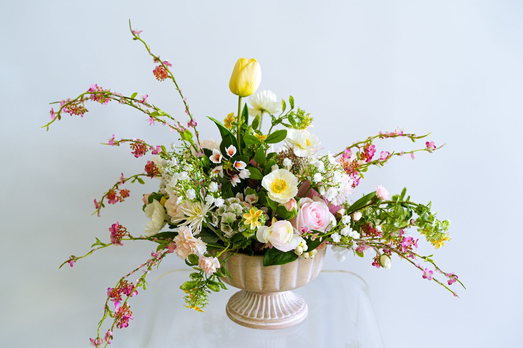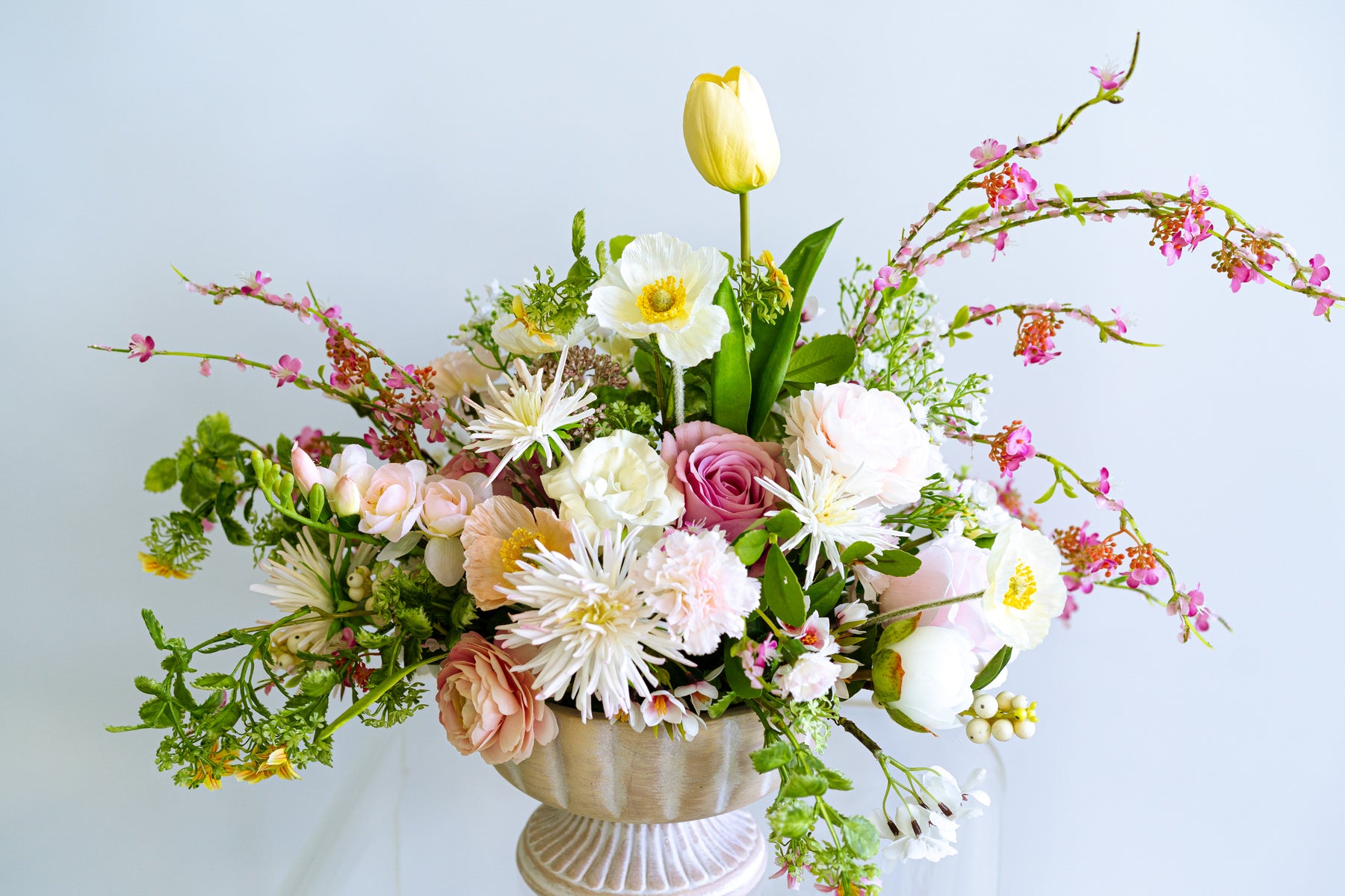 Designed in California, our arrangements blend expert floral craftsmanship with a calm, considered aesthetic. In our Los Altos Hills studio, seasoned designers hand-arrange lifelike stems sourced from the world’s best makers, ensuring natural movement, nuanced color, and enduring beauty—quiet luxury you can style, reuse, and love season after season.