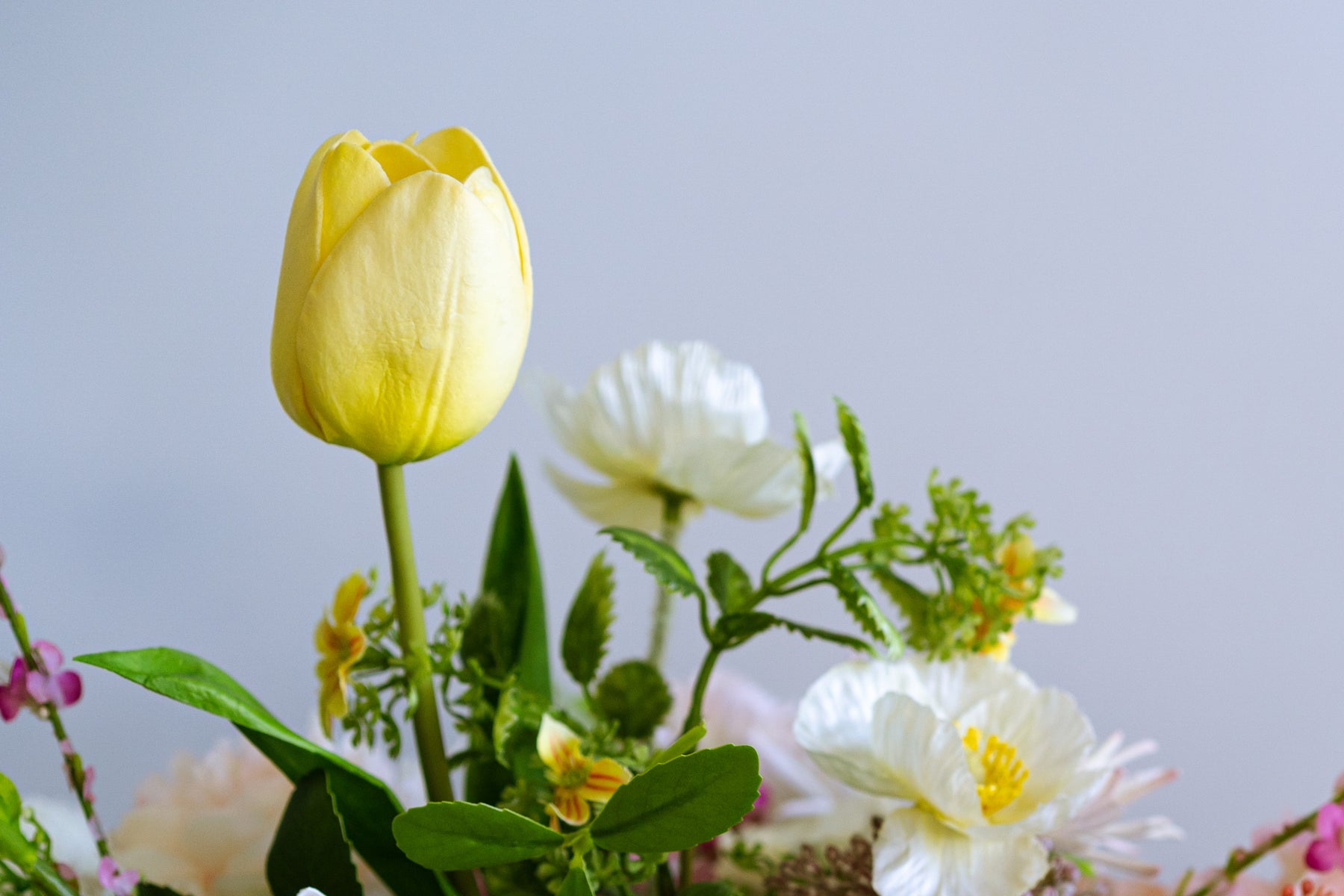 Pair with linen-white runners, light wood, and a single glass taper. Add butter-yellow or blush napkins to echo the petals and let the arrangement set a quietly joyful tone.