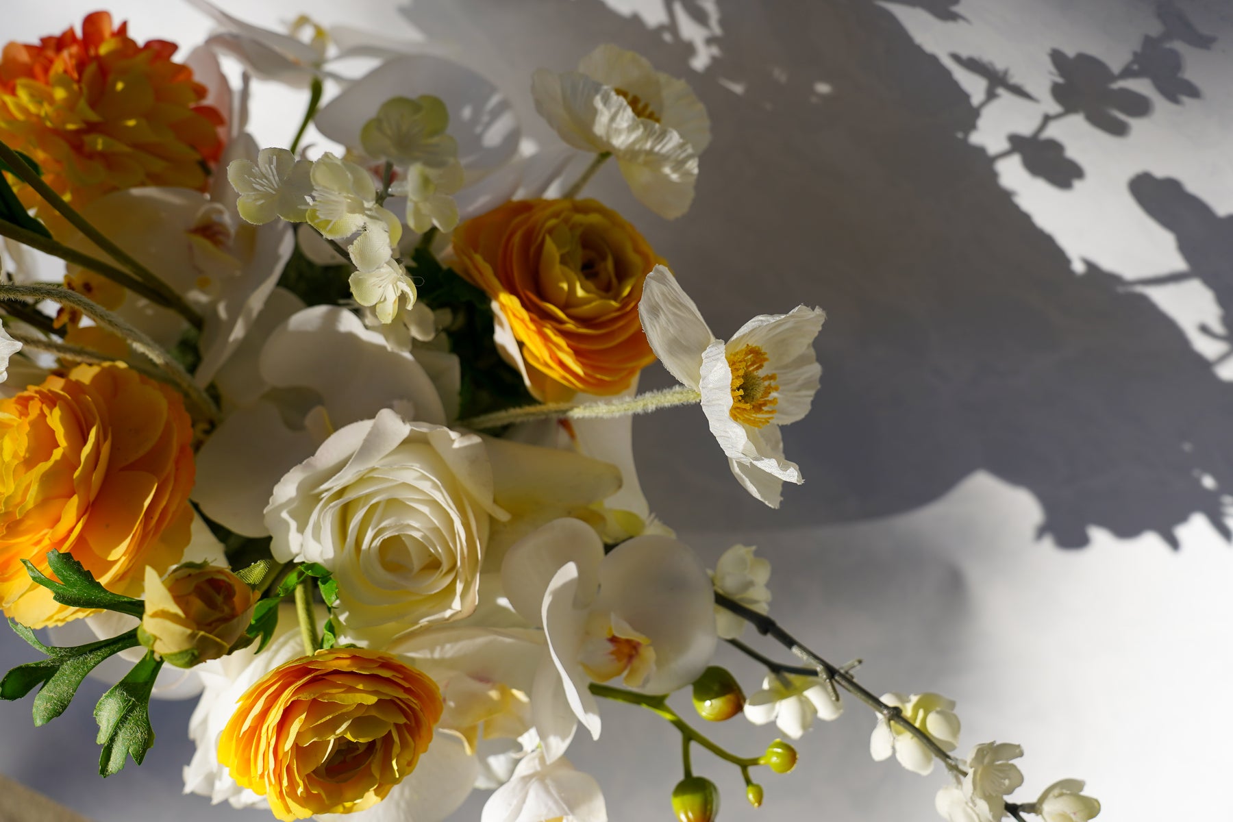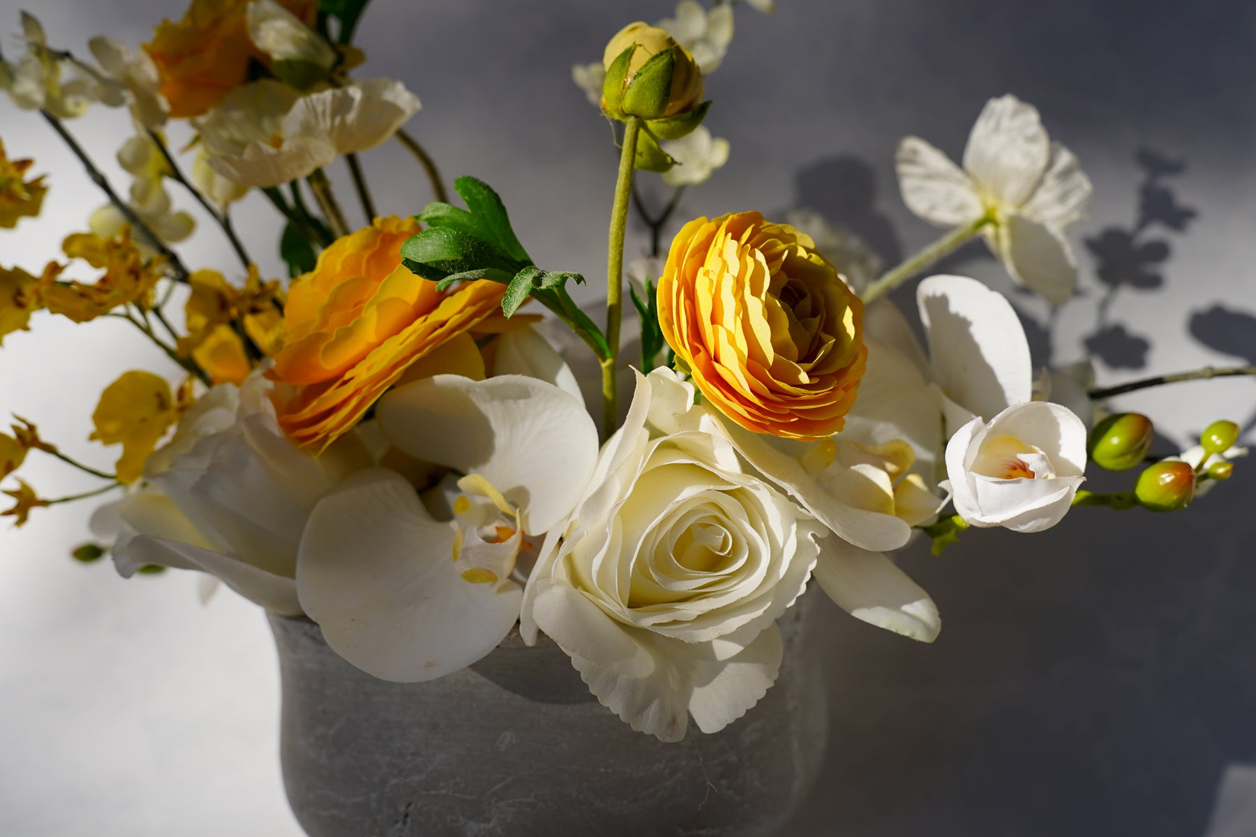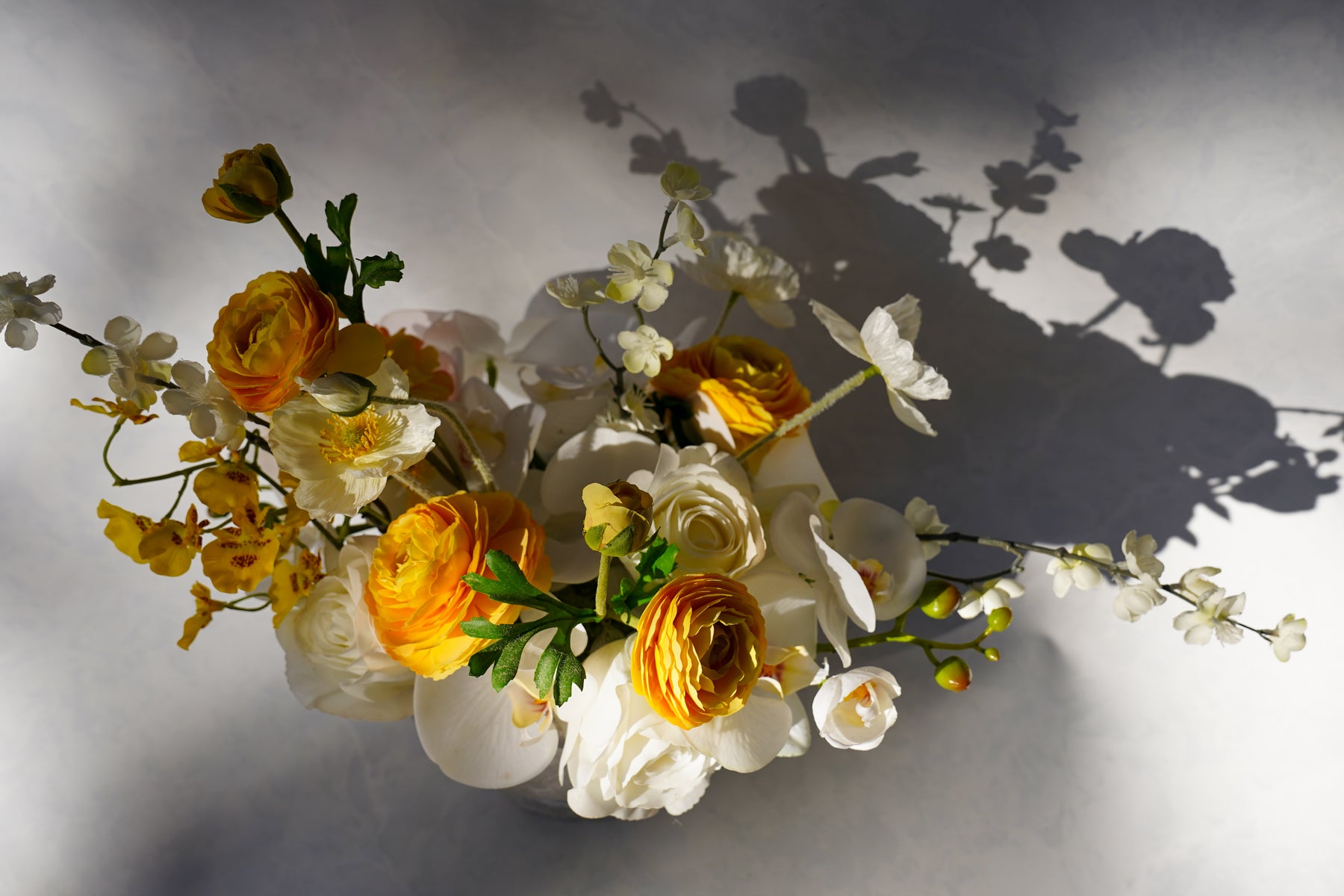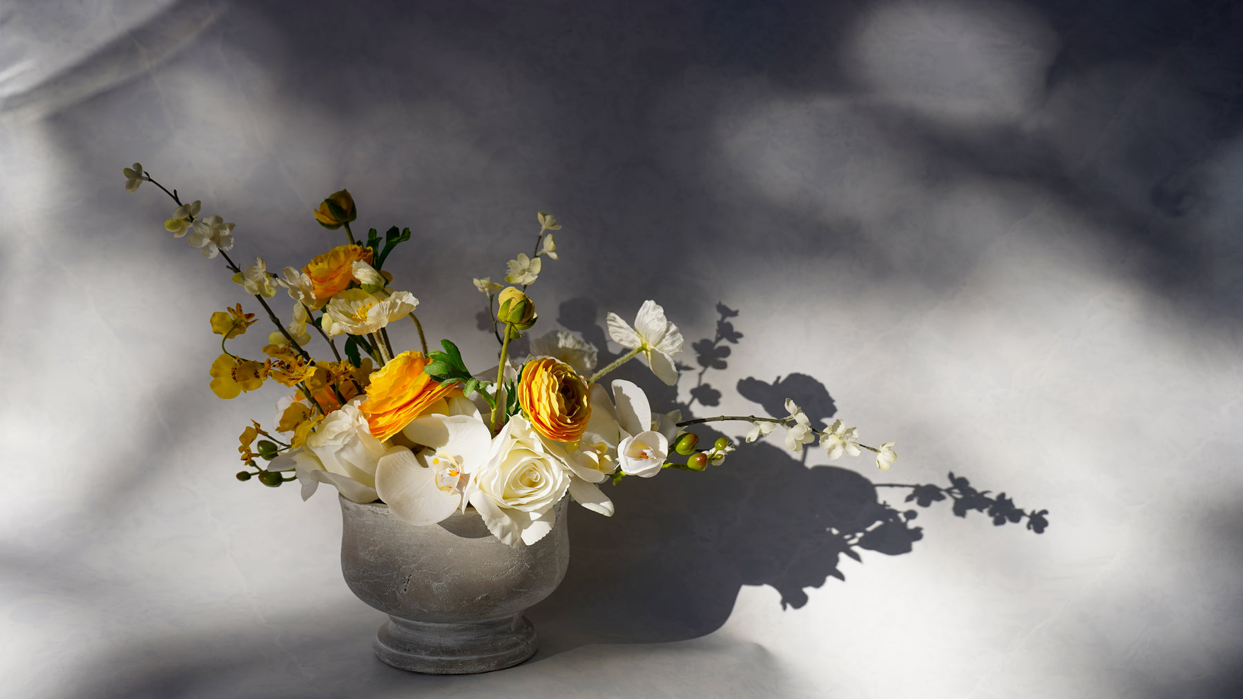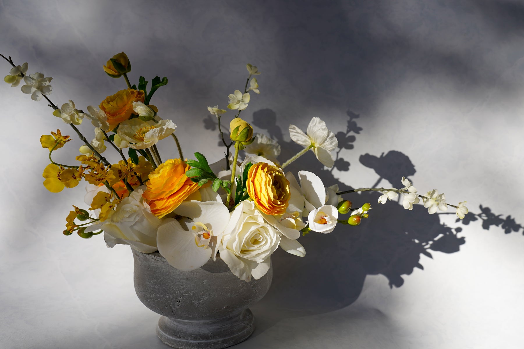 A substantial white stone vase anchors the composition, amplifying the light and giving the arrangement a sculptural, gallery-like presence.