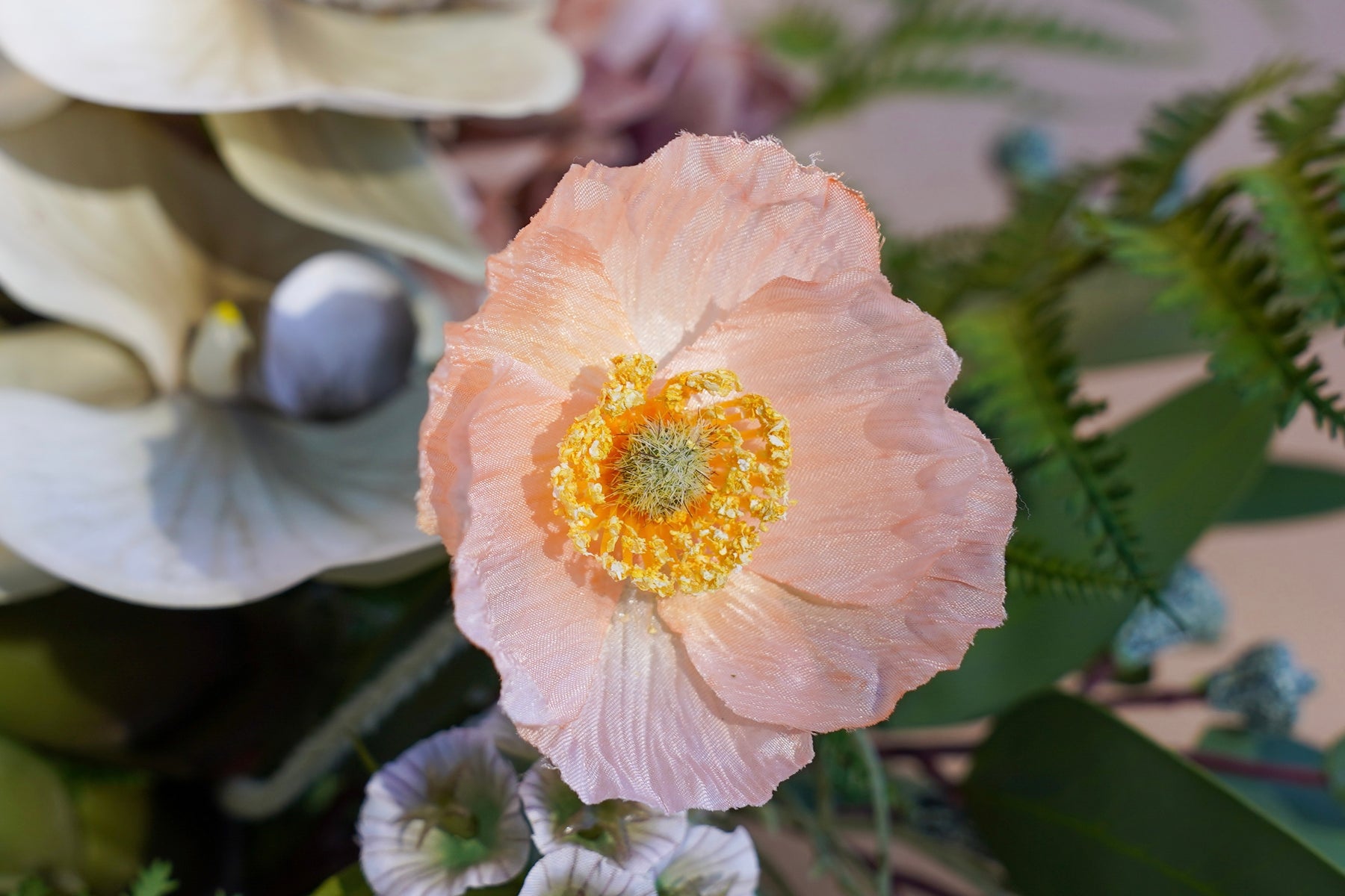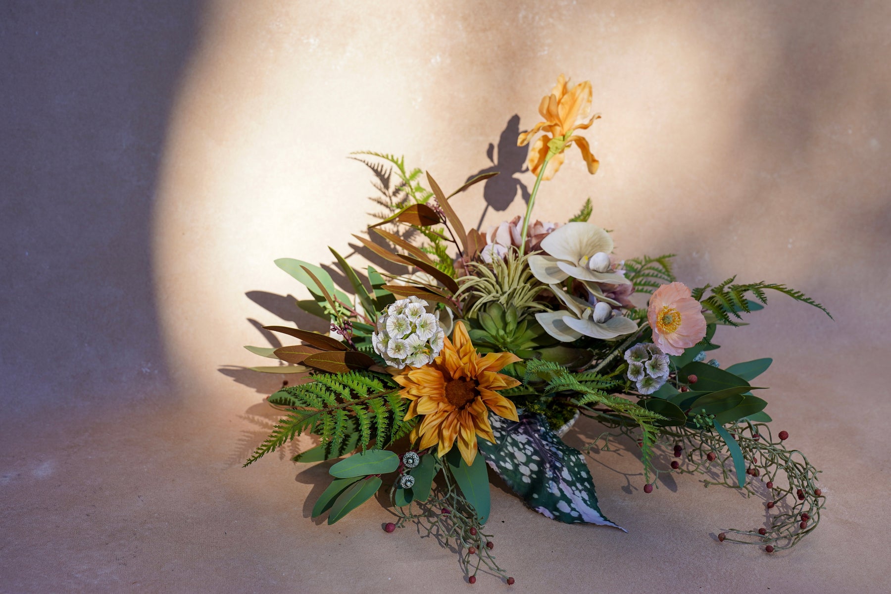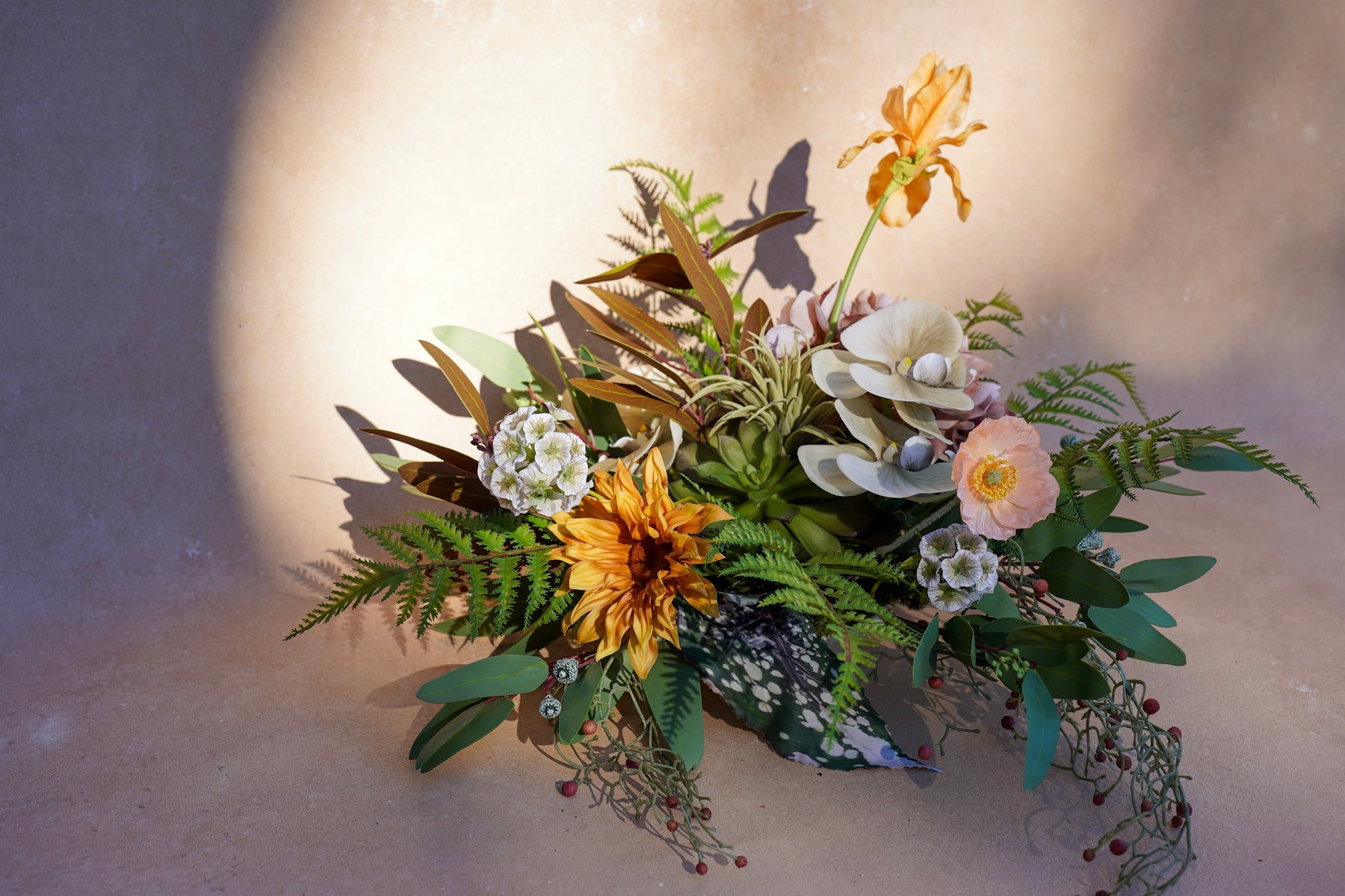 Warm caramel and apricot tones glow against lush greens and rich, cocoa foliage. A peach bloom takes the spotlight, surrounded by textured neutral florals, delicate orchid-like petals, and soft spiky accents for depth. Fern fronds sweep outward to create movement and that signature “designer-arranged” silhouette—full, layered, and effortlessly elevated.