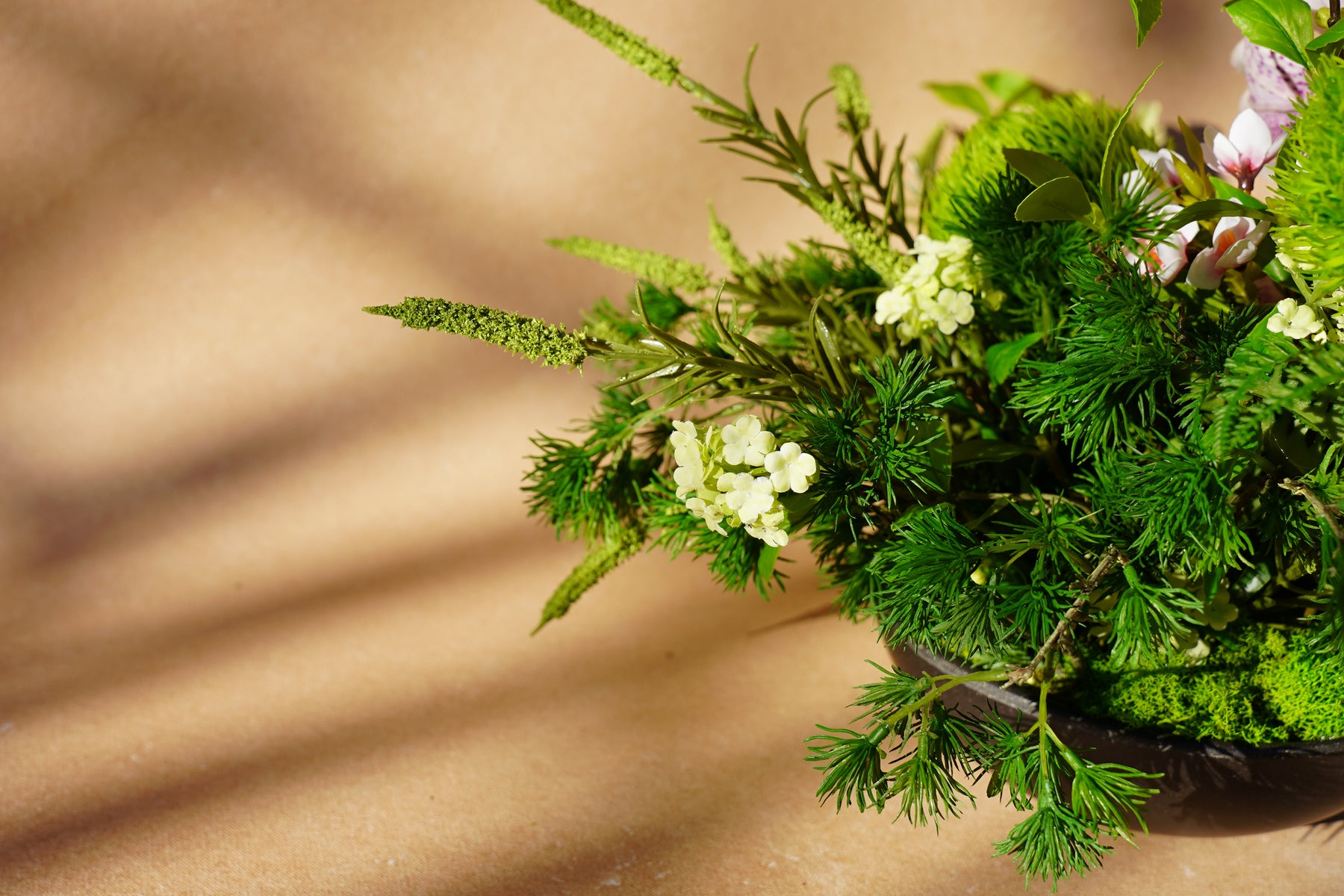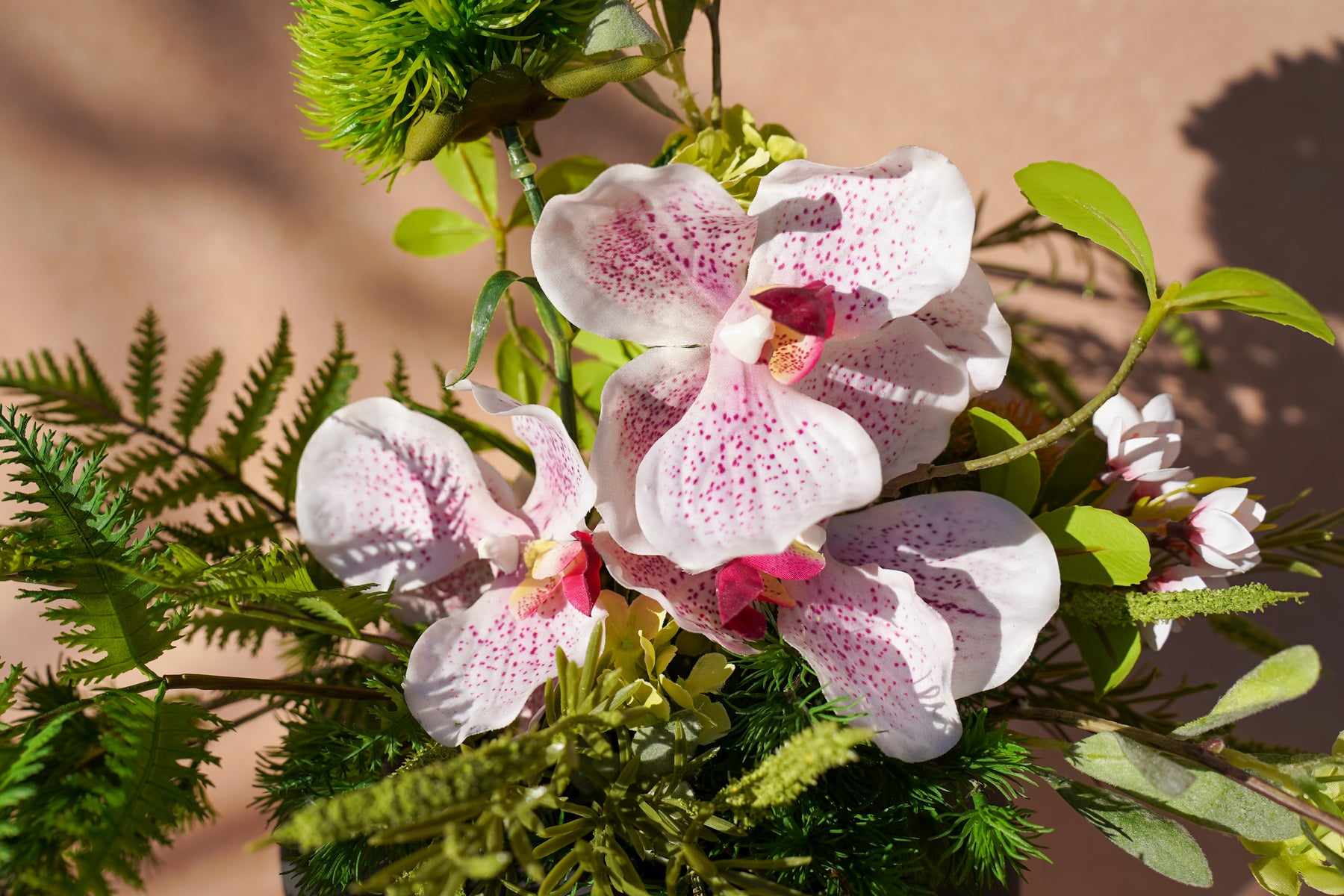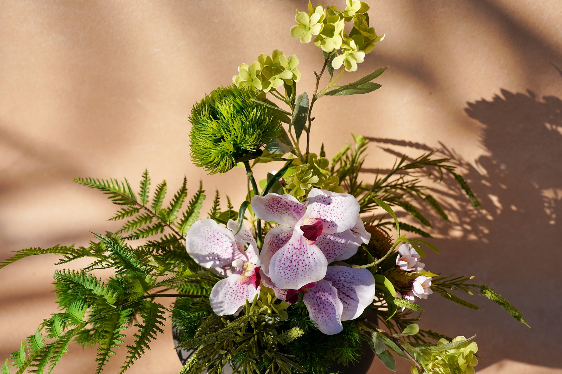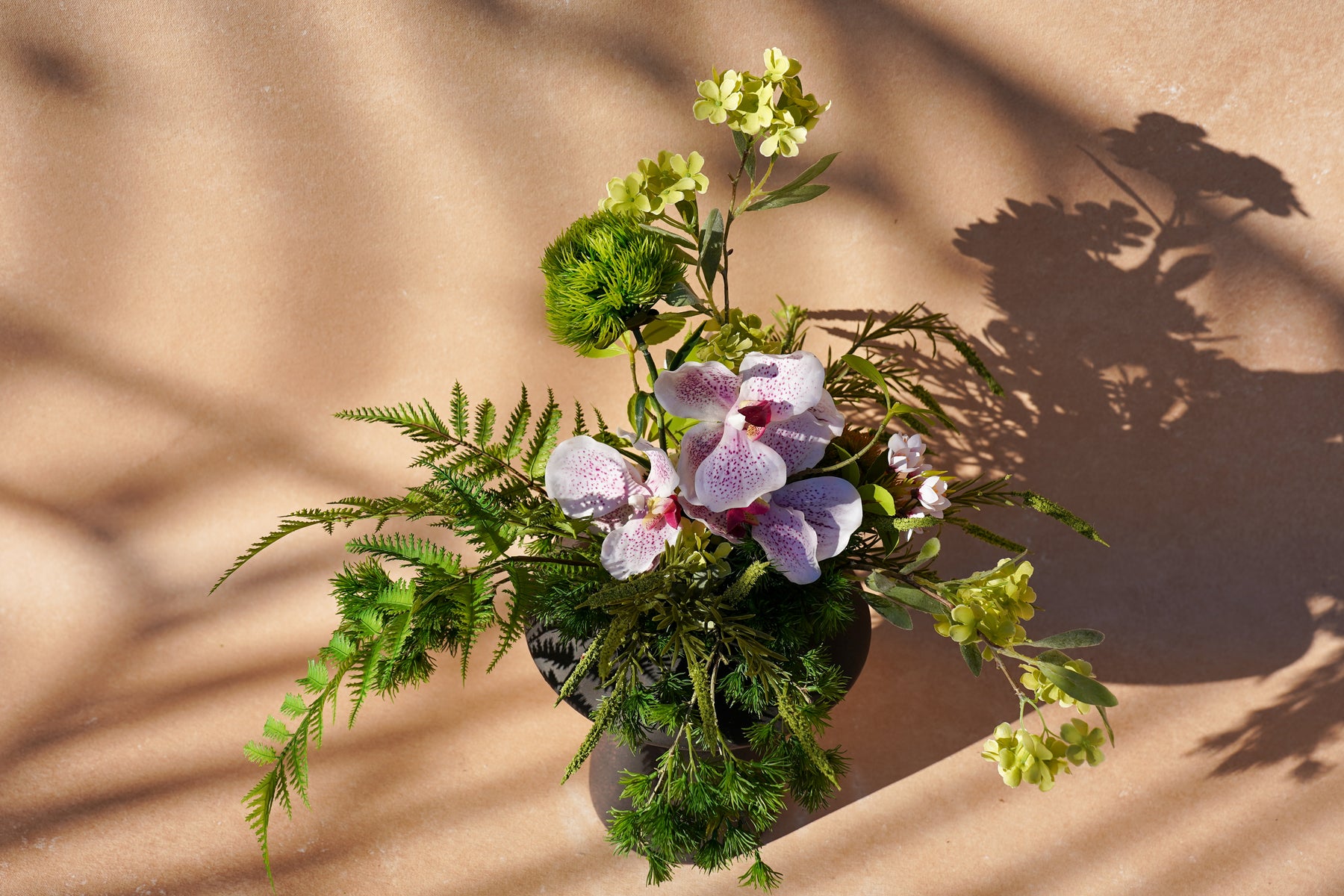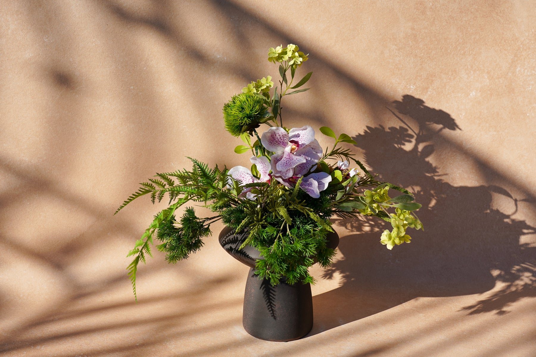 A balanced dialogue of garden greens and soft pink orchid accents, composed in a subtle triangle silhouette that guides the eye upward and then to stillness.