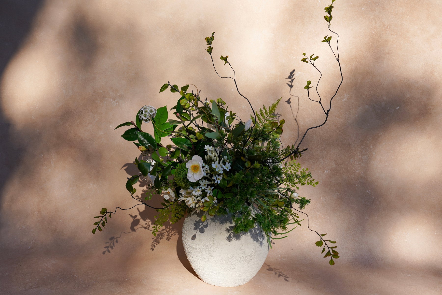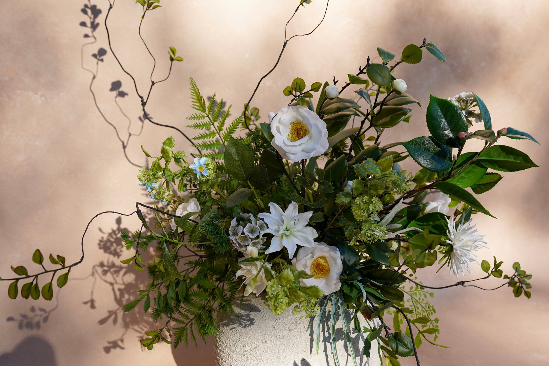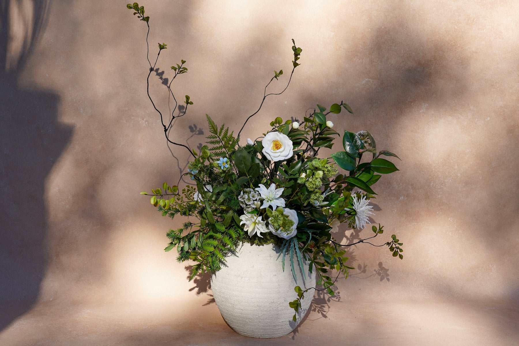 A fresh mix of greens and creamy whites creates a serene, spa-like mood. Rose-style ivory blooms with golden centers sit nestled among glossy foliage, delicate white clusters, and airy botanical accents. Whimsical, winding branches extend outward for a sculptural silhouette—modern, natural, and beautifully balanced.