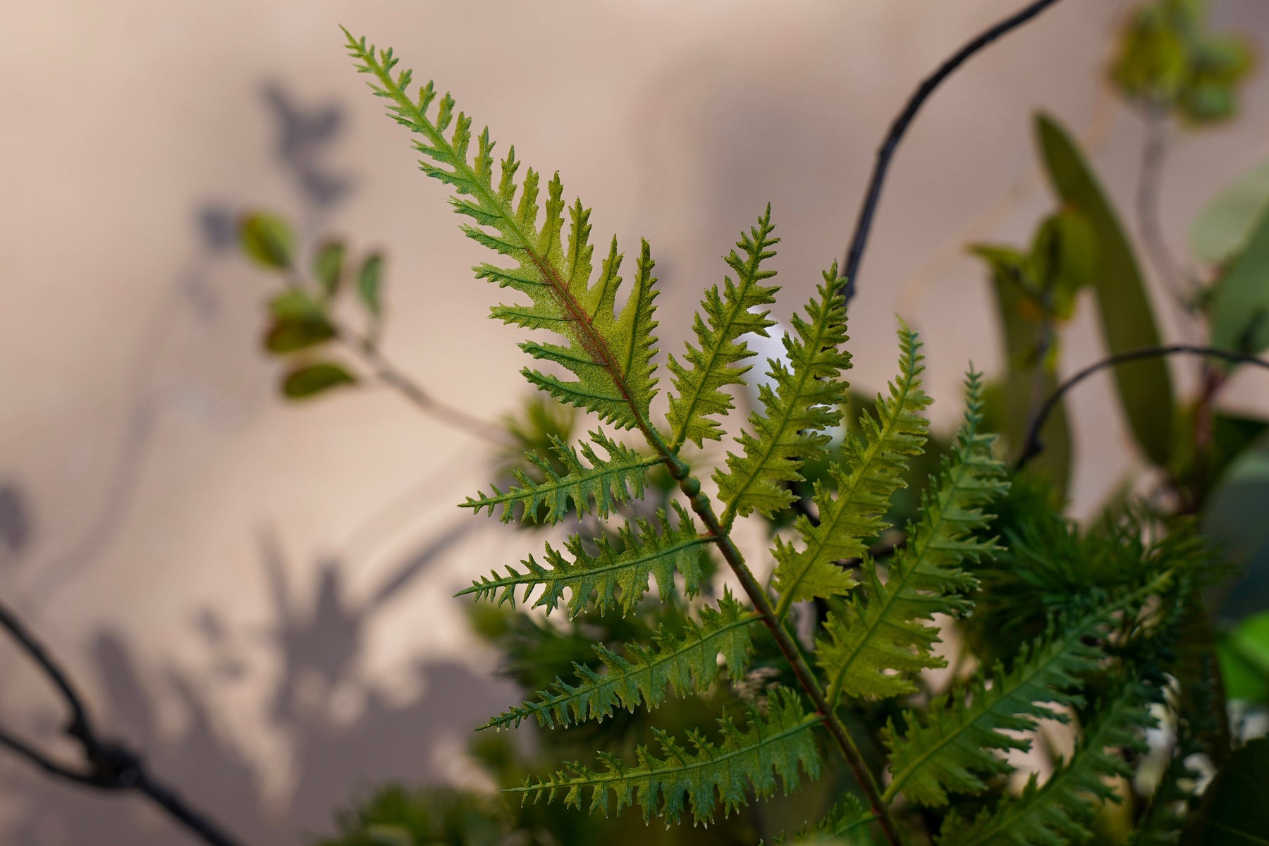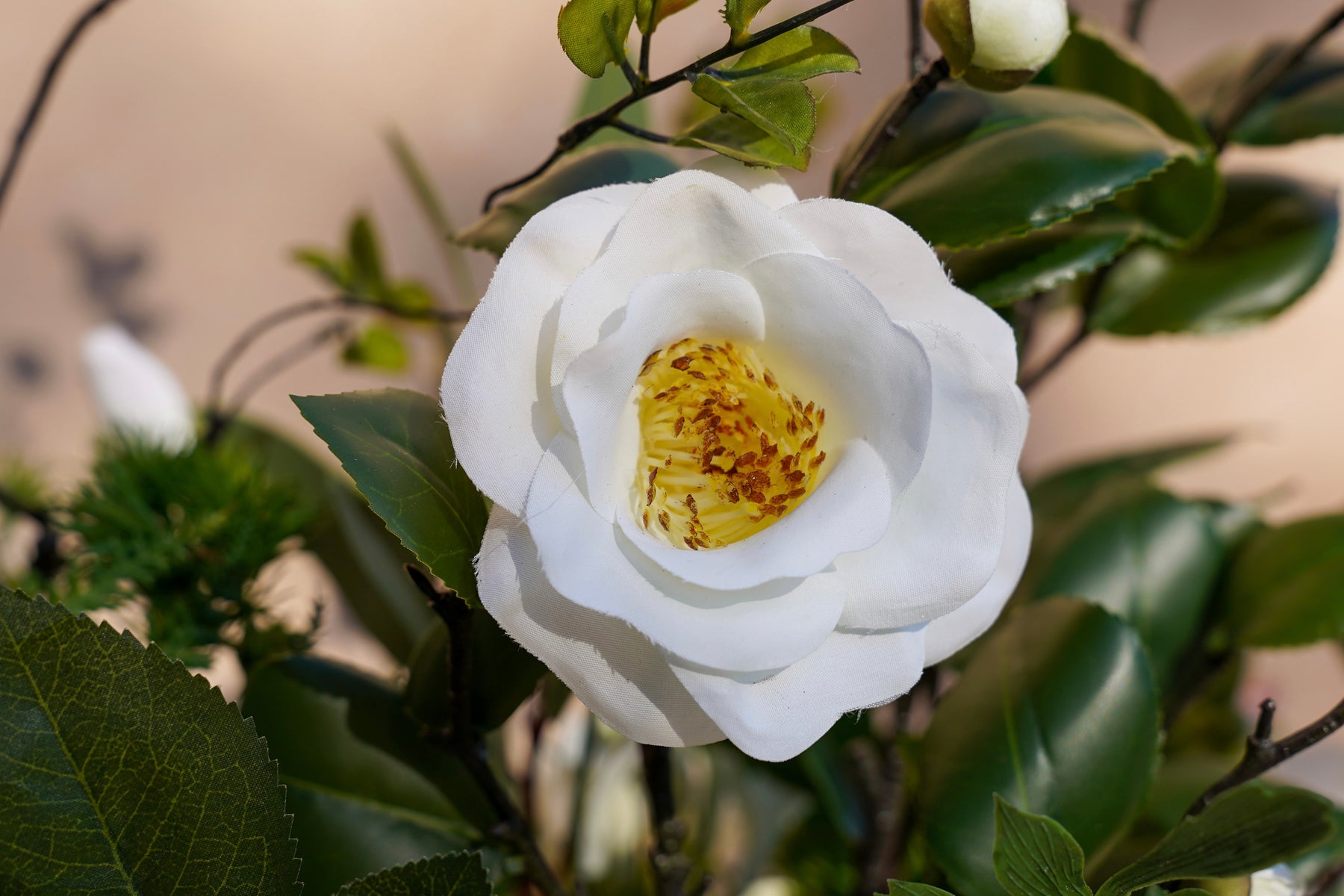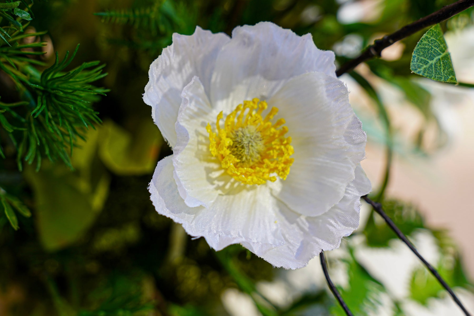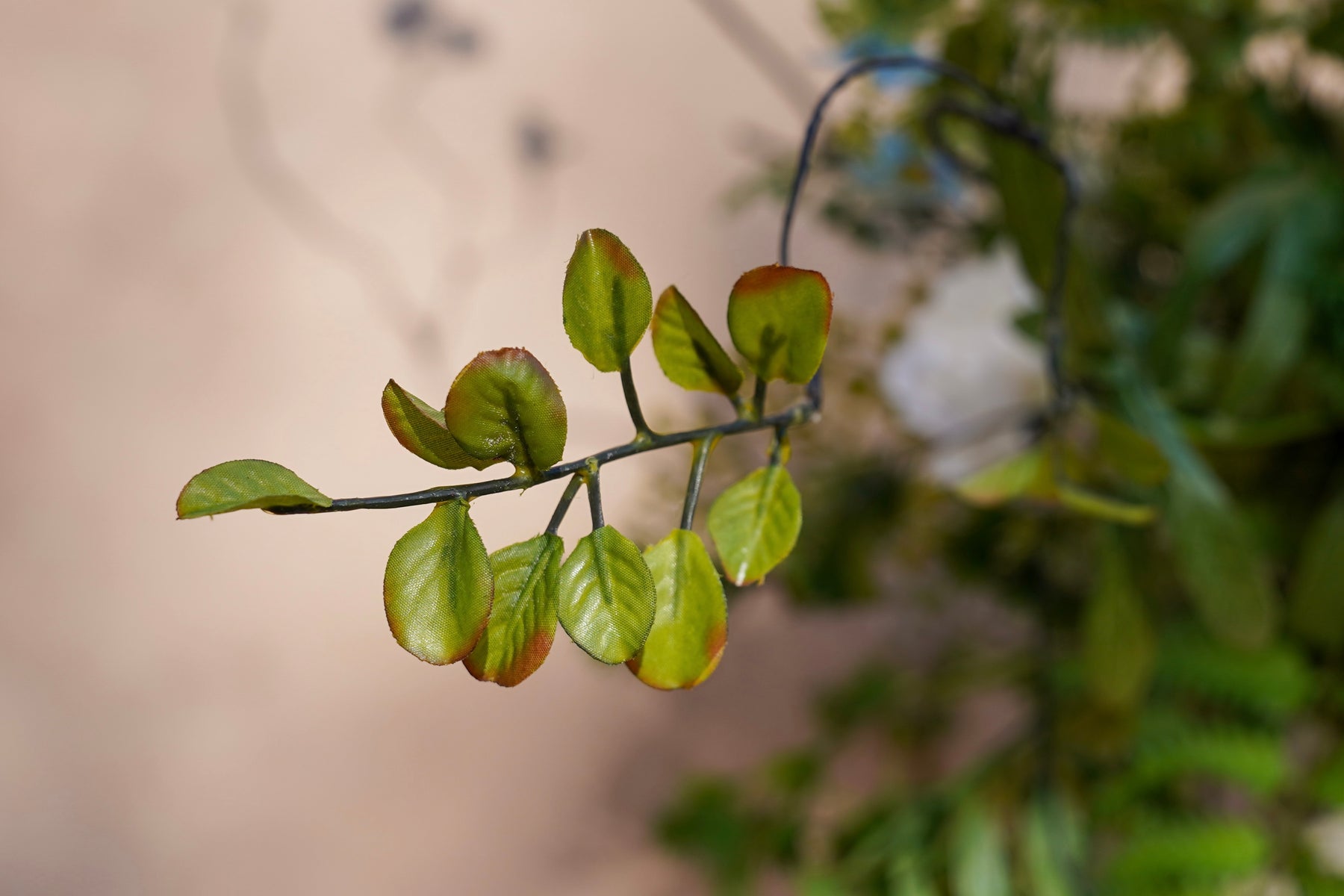 A fresh mix of greens and creamy whites creates a serene, spa-like mood. Rose-style ivory blooms with golden centers sit nestled among glossy foliage, delicate white clusters, and airy botanical accents. Whimsical, winding branches extend outward for a sculptural silhouette—modern, natural, and beautifully balanced.