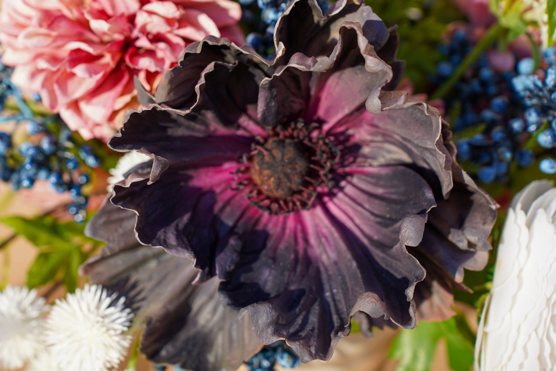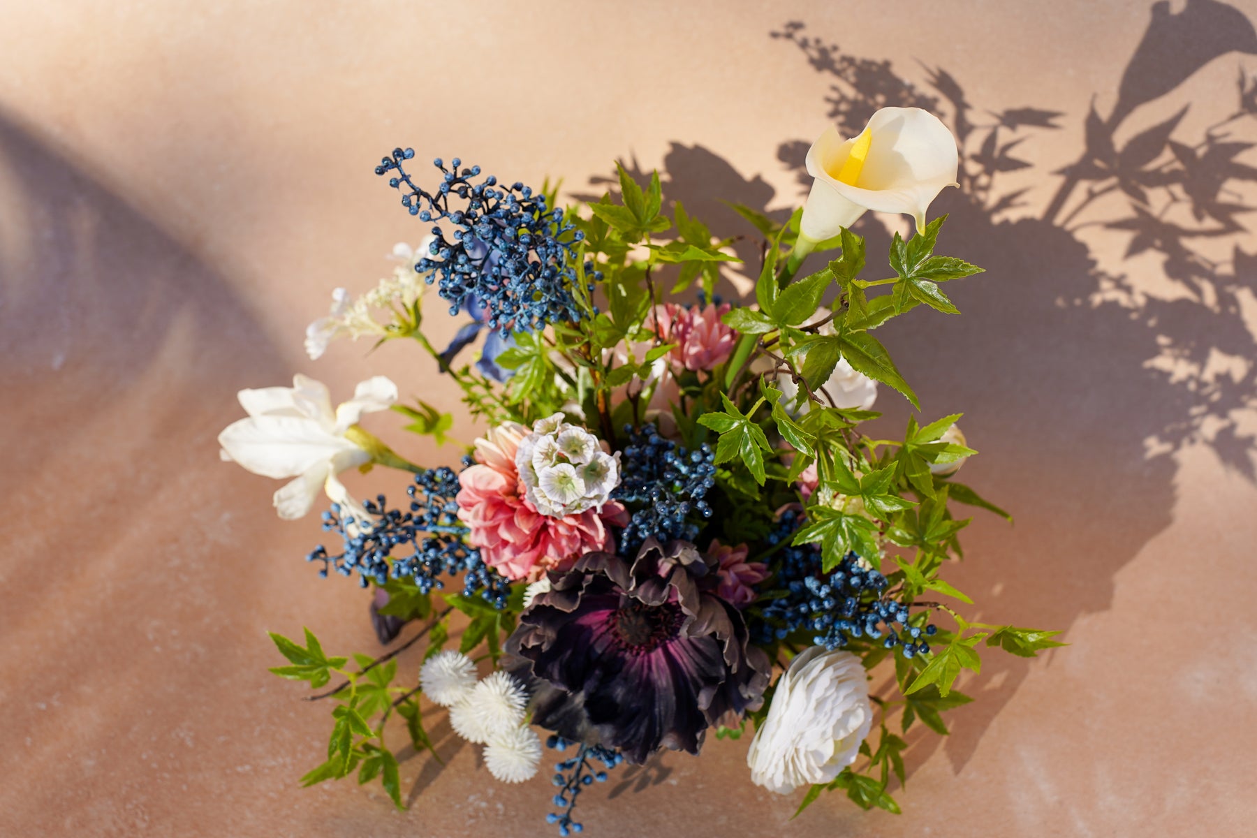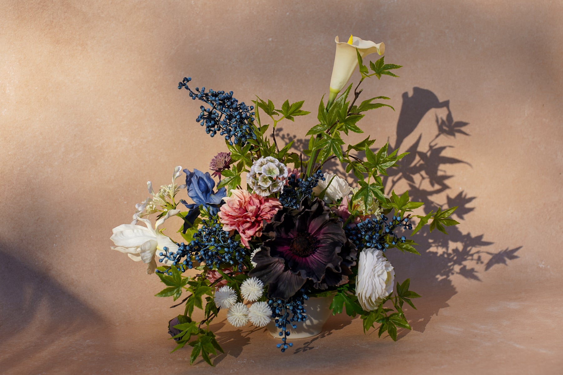 Cream and inky black create a striking contrast, softened with warm cinnamon blooms and deep blue berry clusters. A single ivory calla lily rises clean and architectural, while ranunculus-style rosettes, textured white pom accents, and airy blossoms add depth. Glossy green foliage spills outward for movement and a styled, designer silhouette that looks beautiful from every angle.