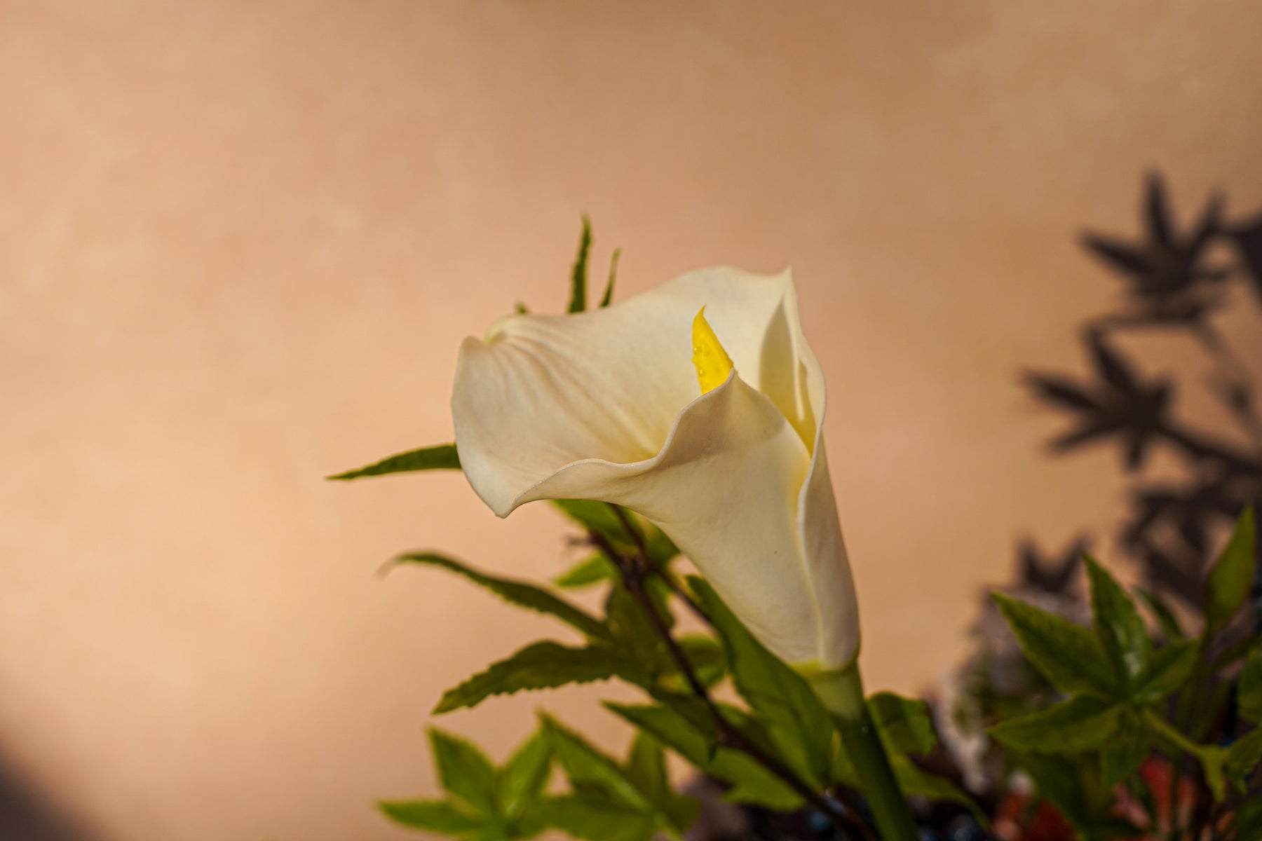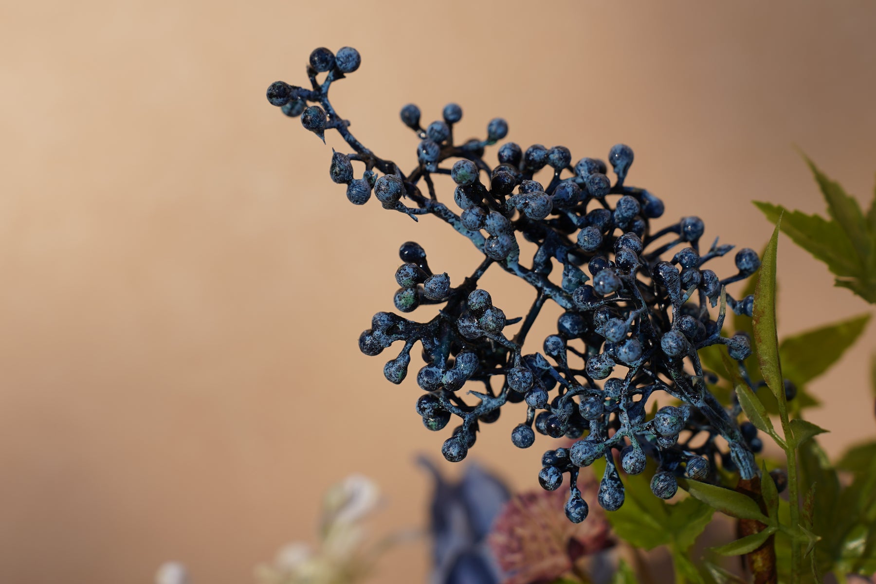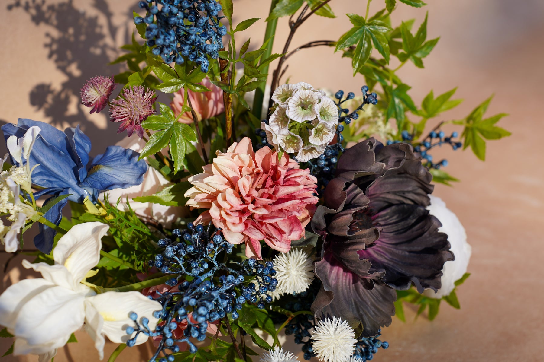 Cream and inky black create a striking contrast, softened with warm cinnamon blooms and deep blue berry clusters. A single ivory calla lily rises clean and architectural, while ranunculus-style rosettes, textured white pom accents, and airy blossoms add depth. Glossy green foliage spills outward for movement and a styled, designer silhouette that looks beautiful from every angle.