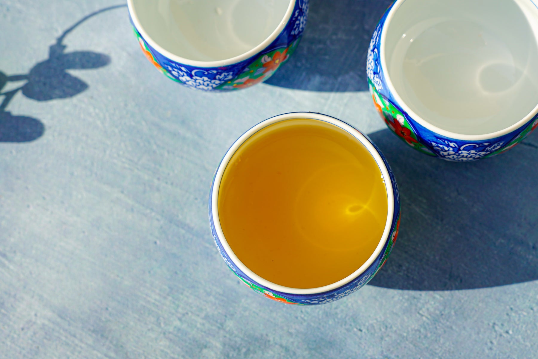 The interior of each cup remains a pure, glossy white—intentionally unadorned to honor the color and clarity of the tea itself.