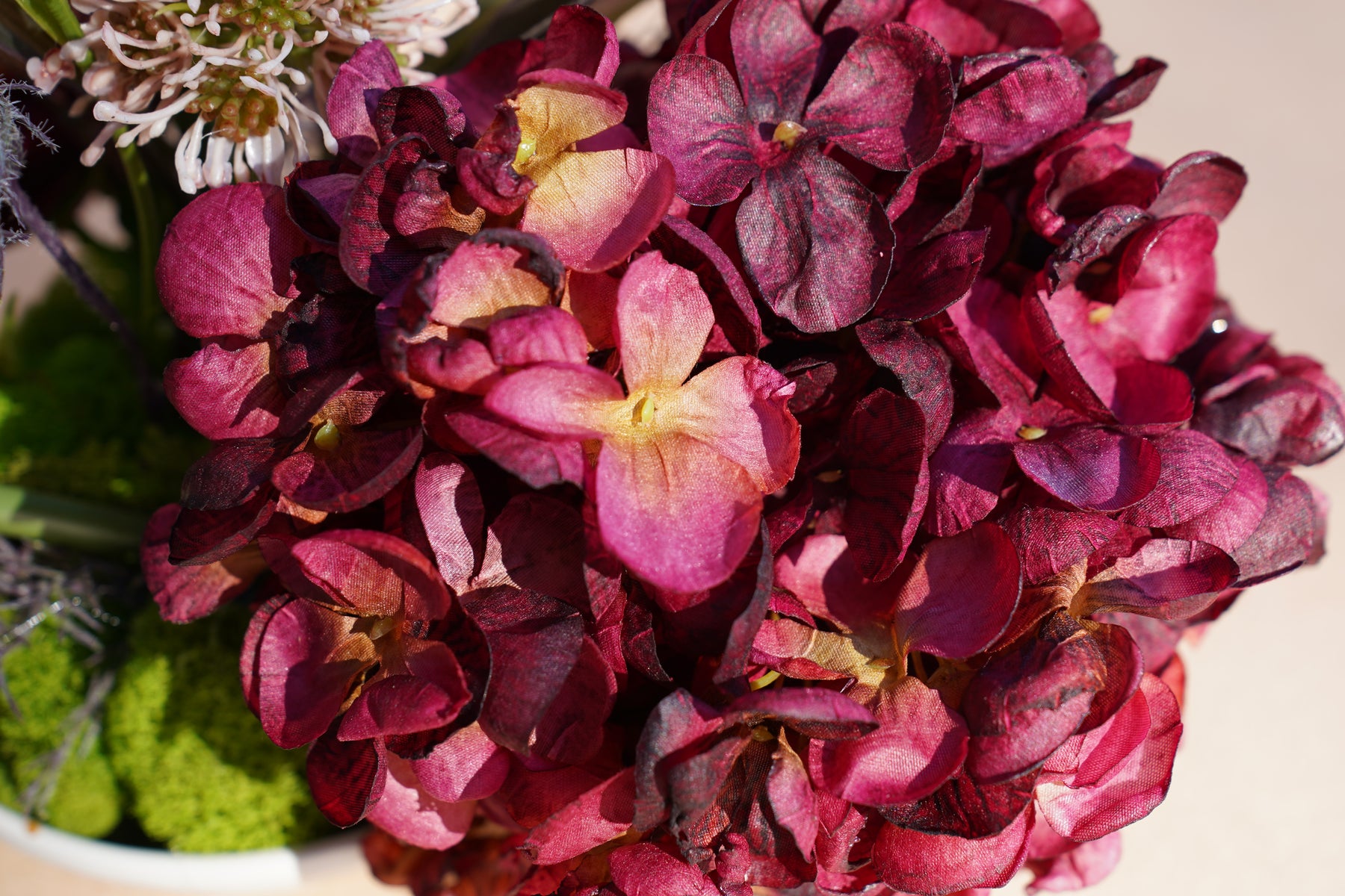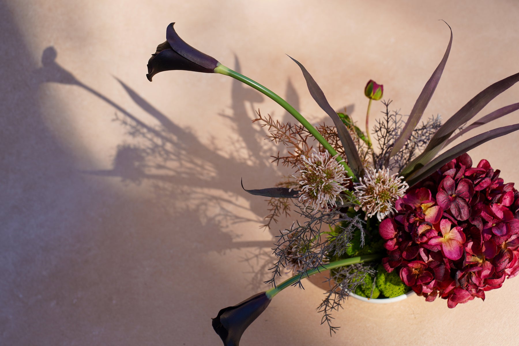 A dramatic palette of deep burgundy, inky black, muted plum, and moss green creates richness and contrast. Black calla lilies rise with architectural elegance, paired with lush burgundy hydrangeas, textured globe blooms, and sculptural foliage. Soft moss at the base grounds the composition, while elongated lines and asymmetry create movement and visual tension with a distinctly editorial finish.
