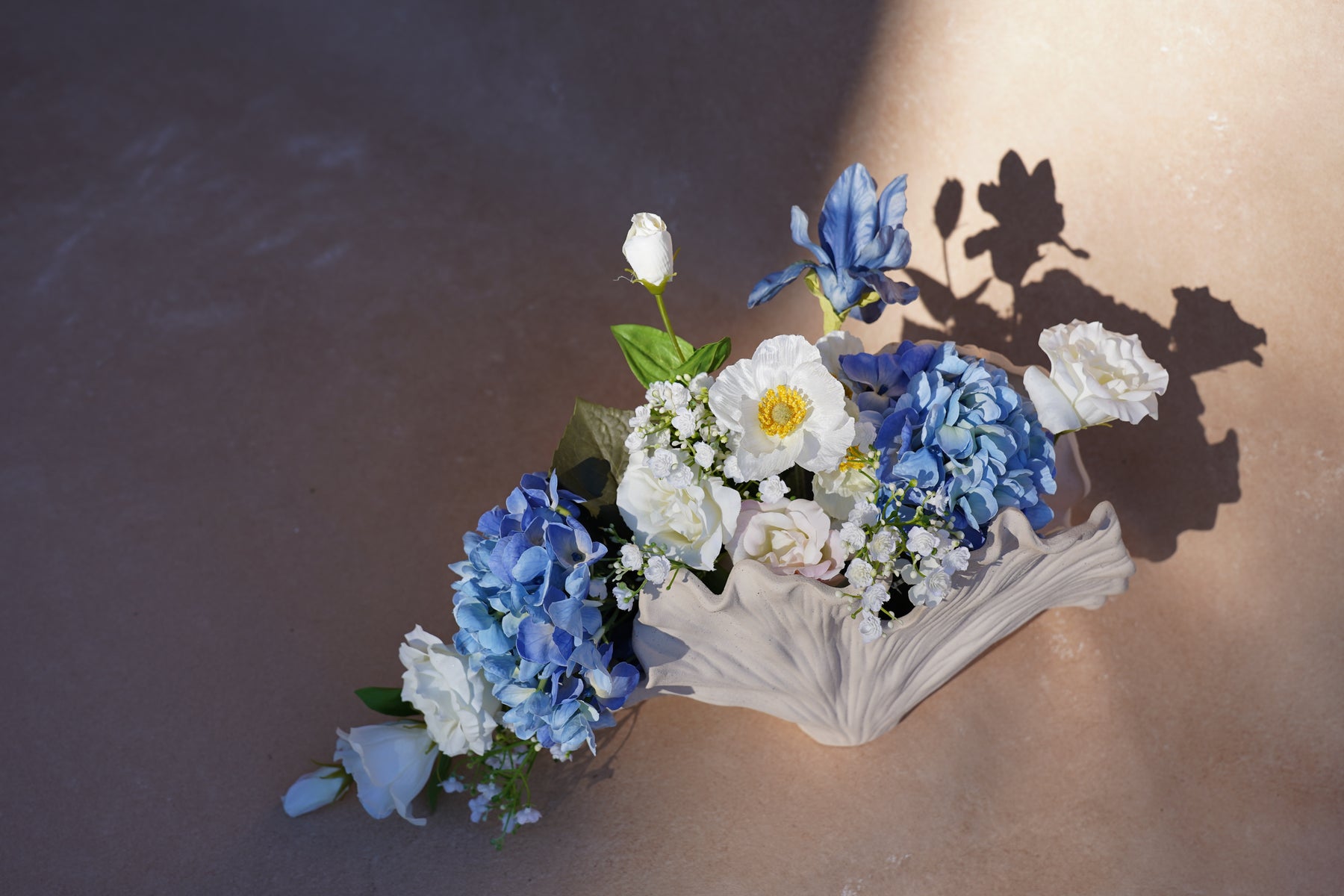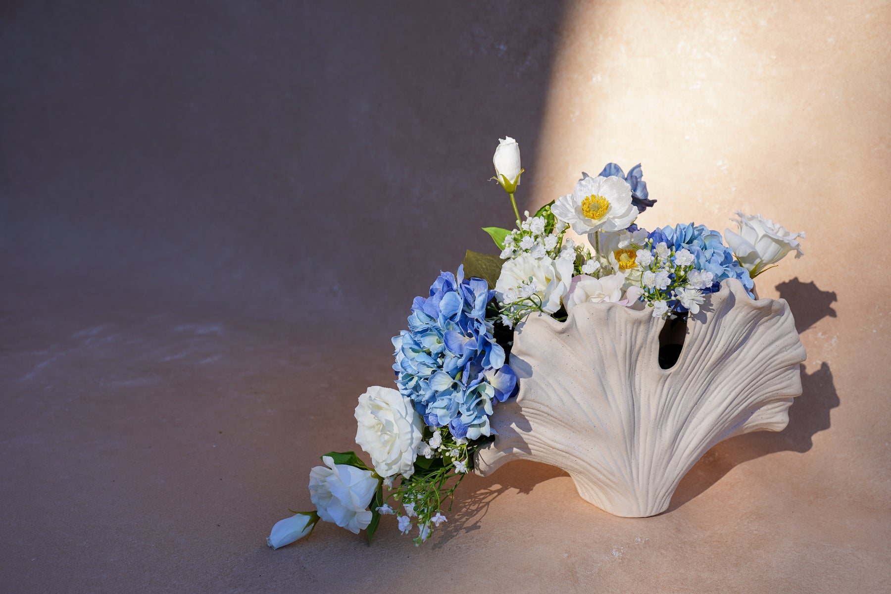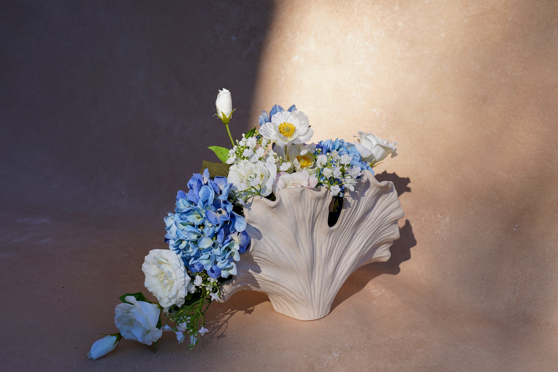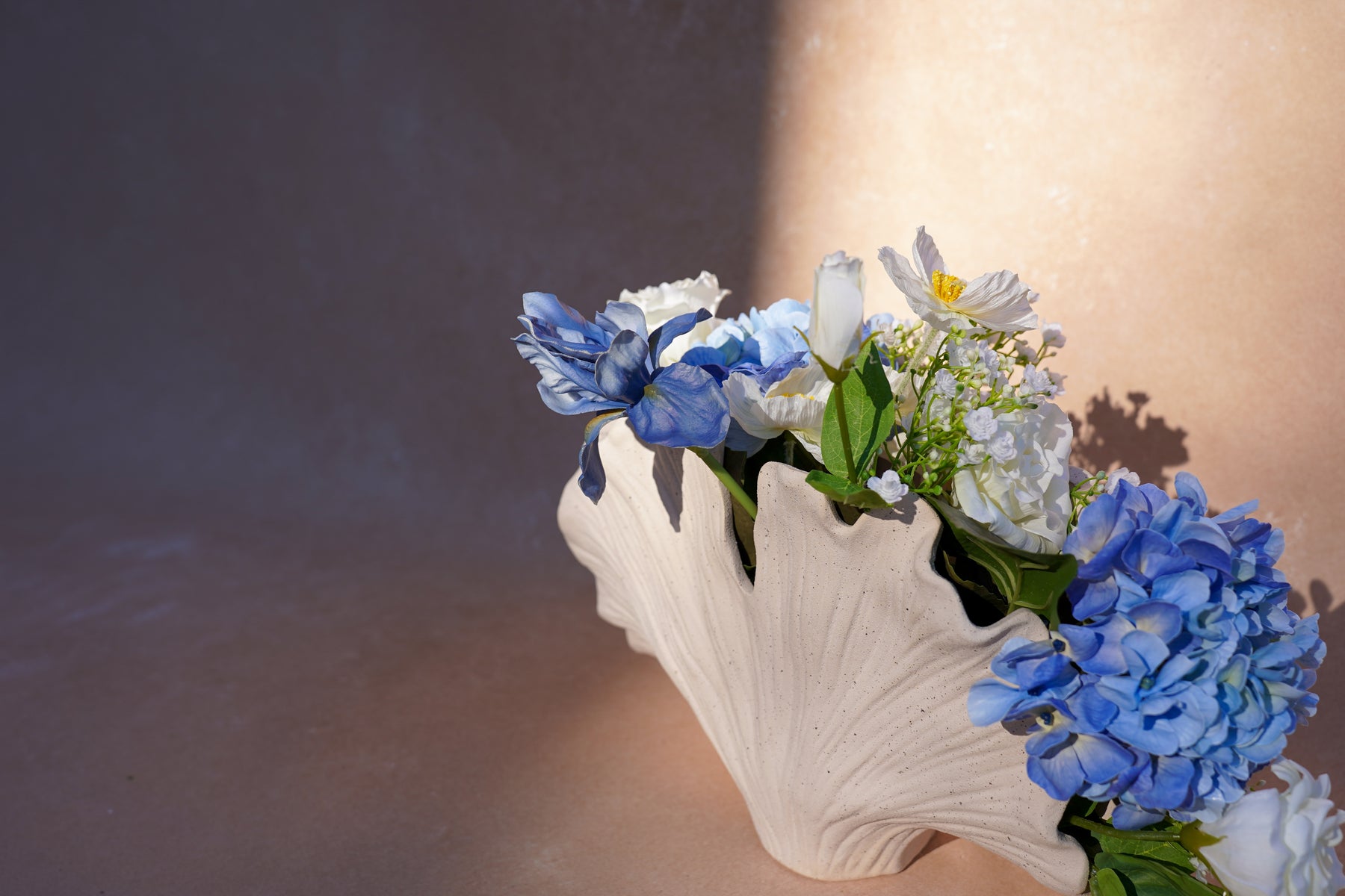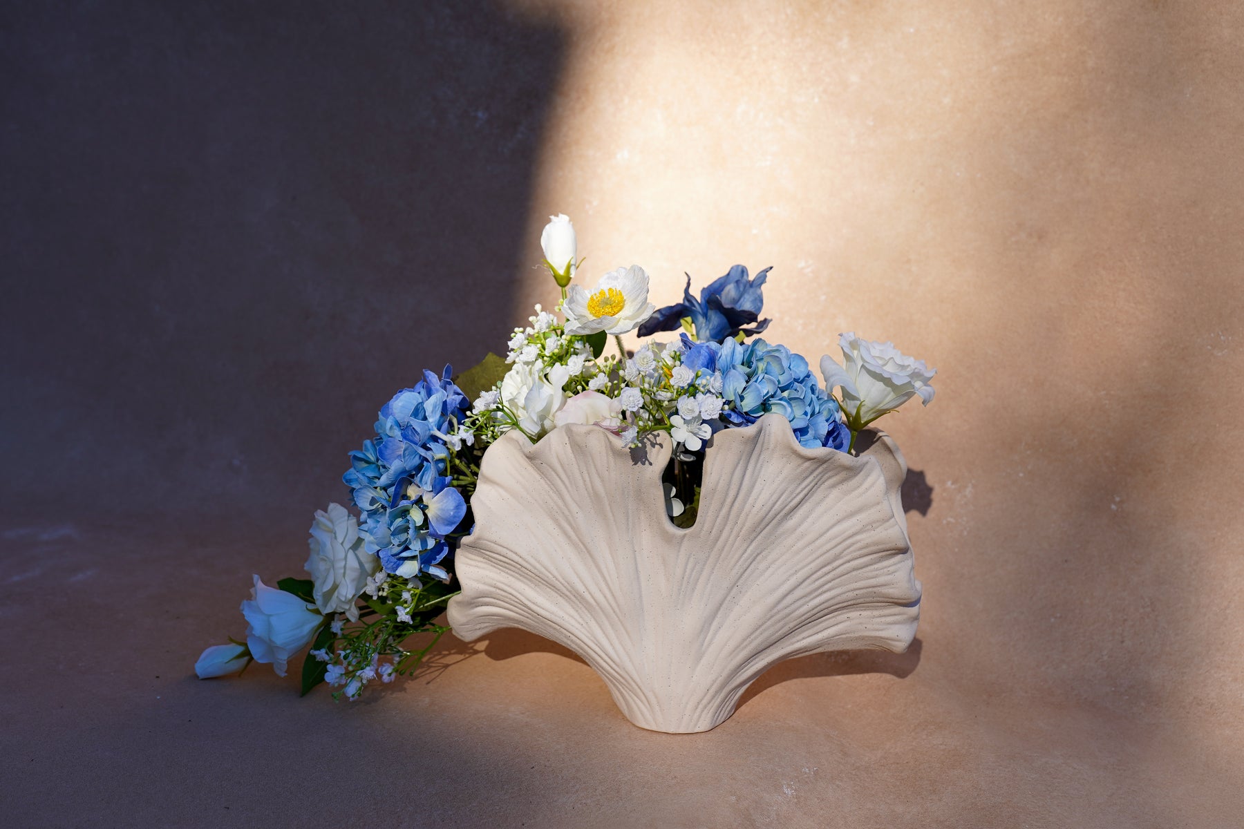 A sculptural vase echoing a seashell or ginkgo form—its curves read like ocean swells, grounding the design while amplifying its coastal grace.