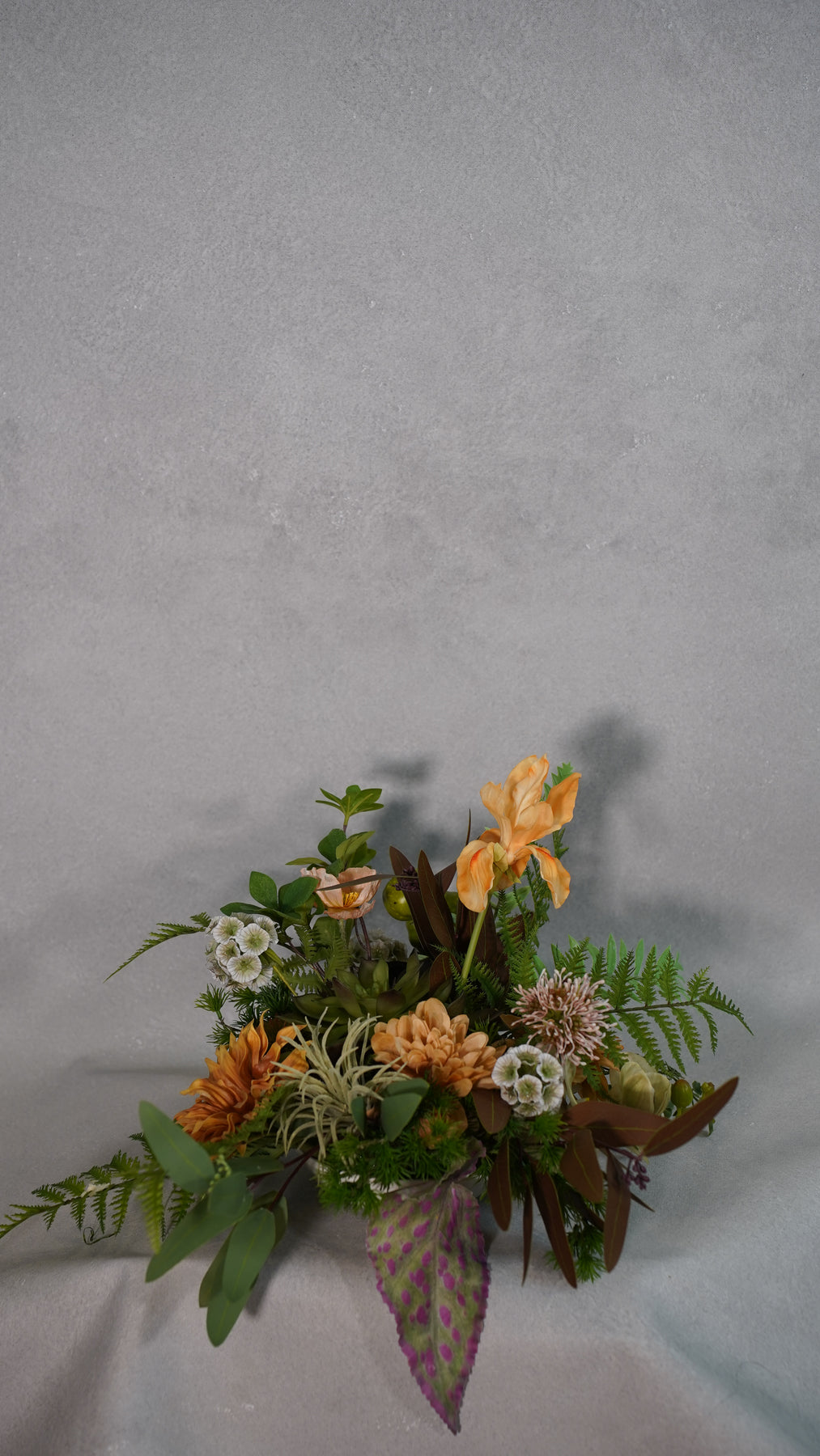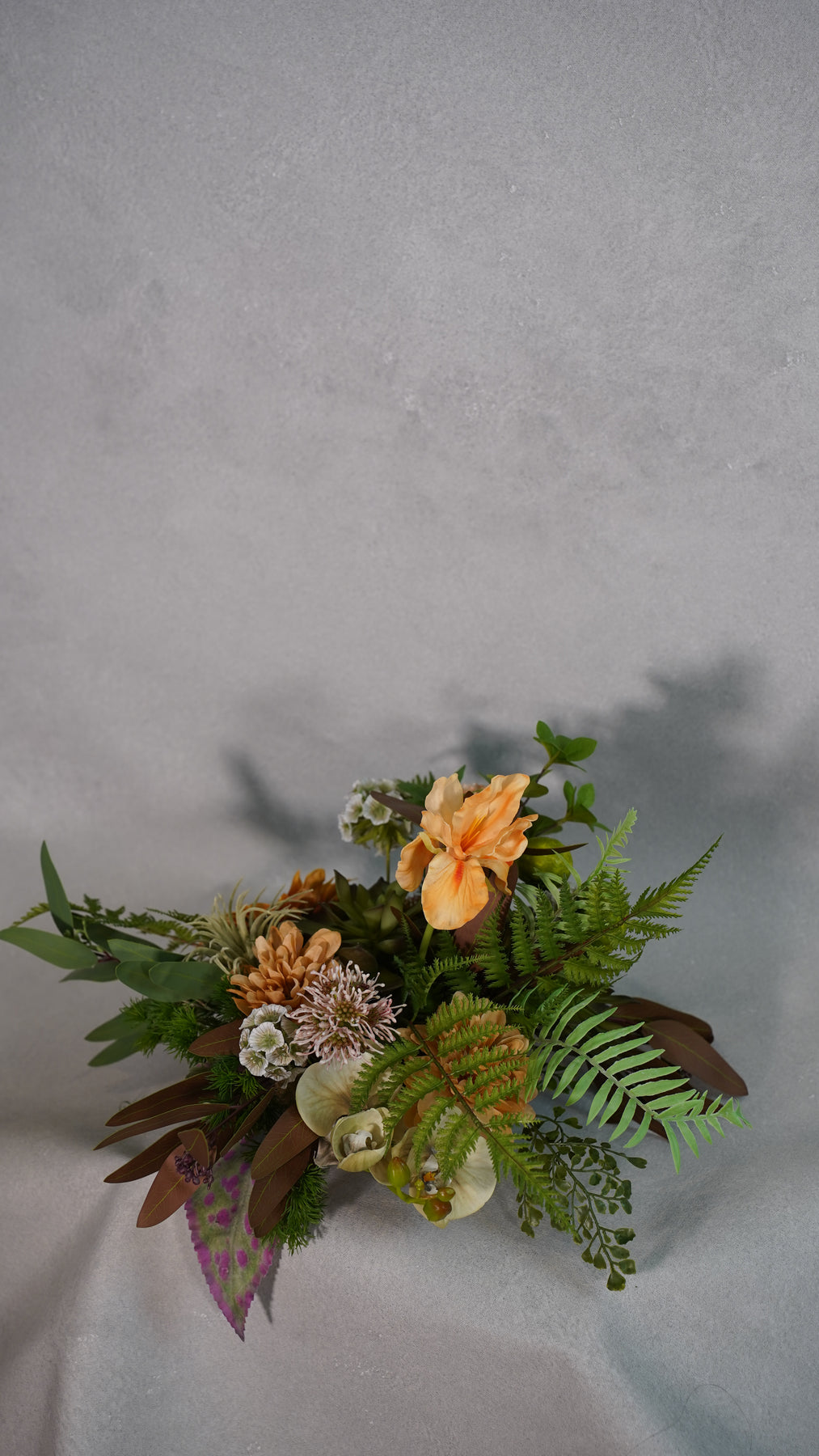 Warm caramel and apricot tones glow against lush greens and rich, cocoa foliage. A peach bloom takes the spotlight, surrounded by textured neutral florals, delicate orchid-like petals, and soft spiky accents for depth. Fern fronds sweep outward to create movement and that signature “designer-arranged” silhouette—full, layered, and effortlessly elevated.