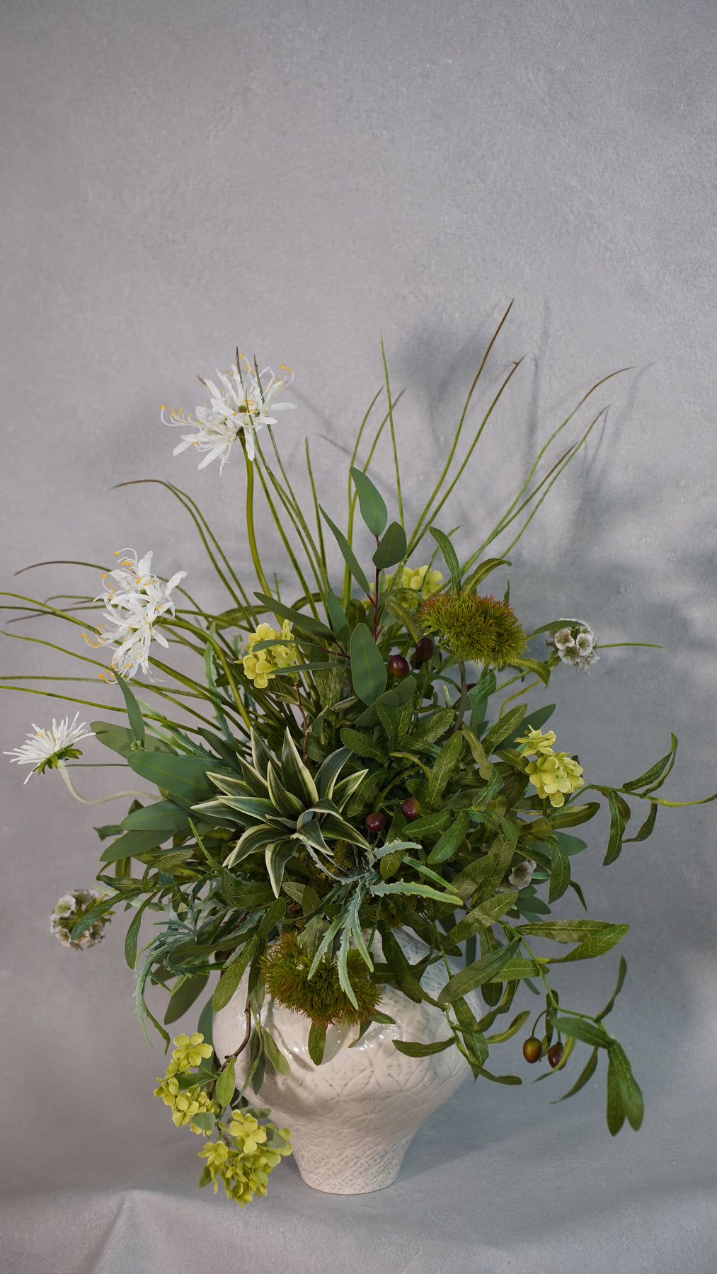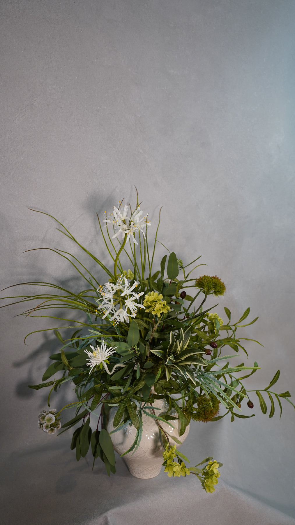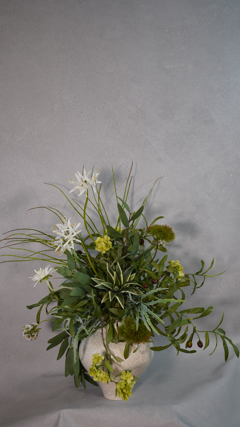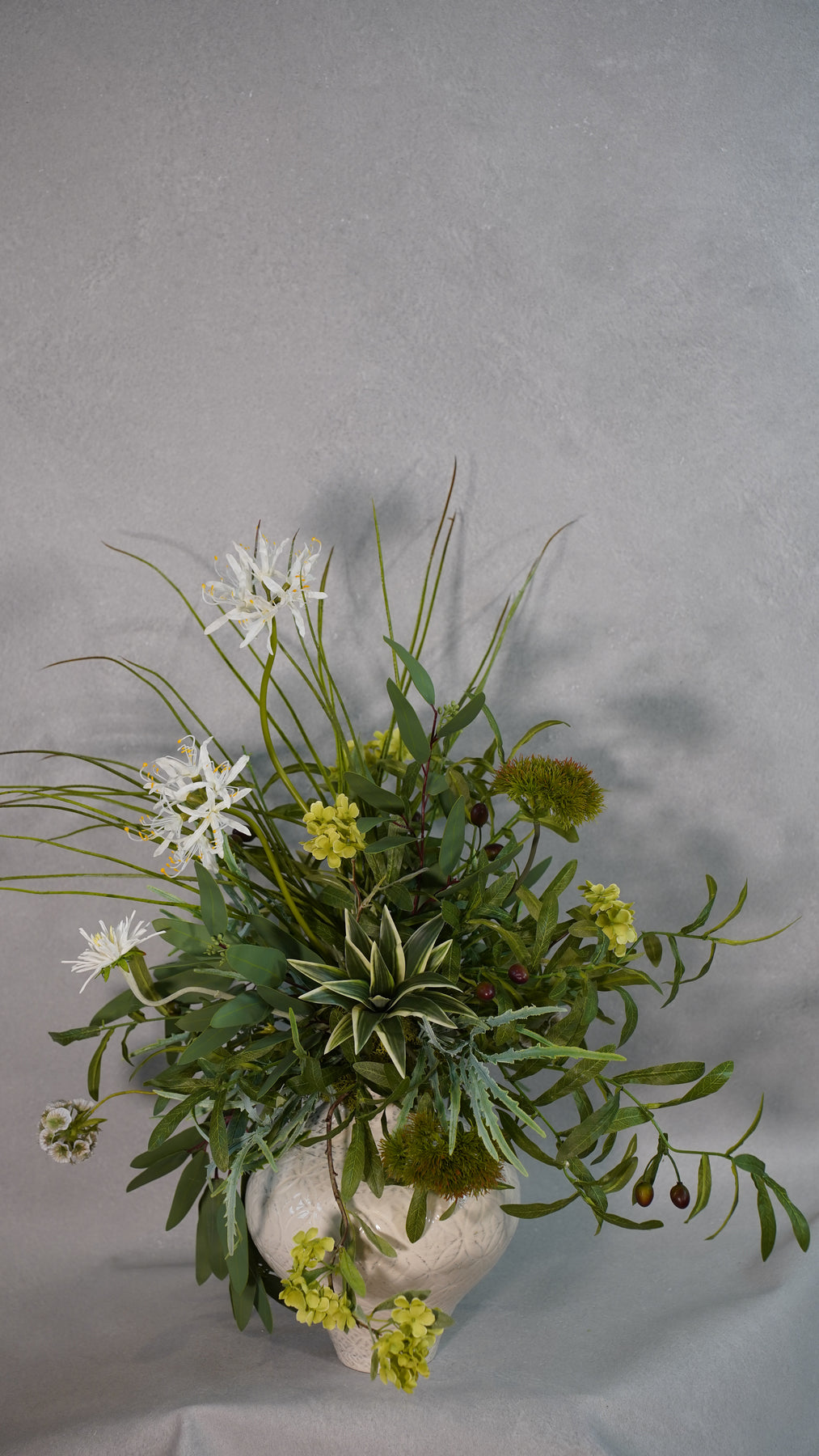 A layered mix of crisp greens and soft ivory creates a clean, modern look. Wispy white spider blooms float above sculptural foliage, with chartreuse accents and berry-like details adding depth. A variegated, succulent-style center gives the design a contemporary edge, while flowing greenery extends outward for movement and a “styled, not stuffed” silhouette.