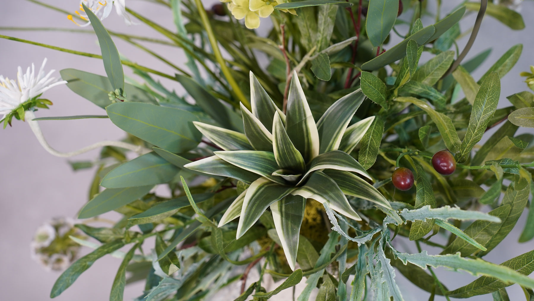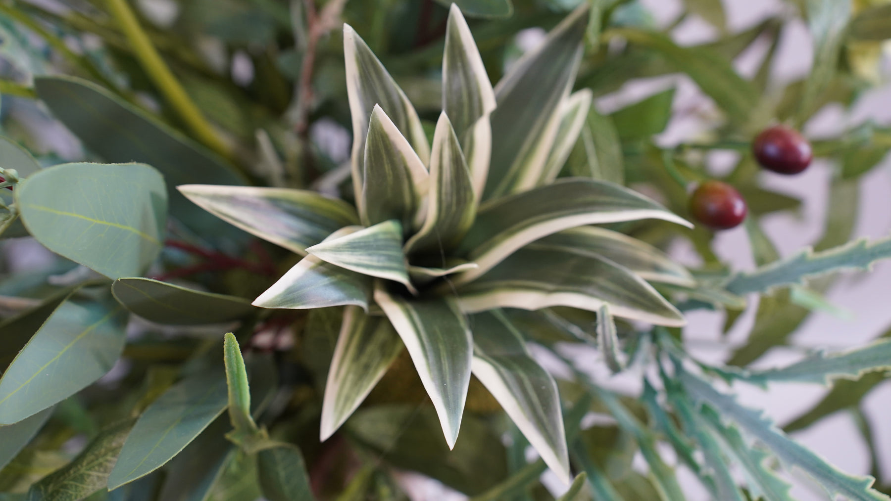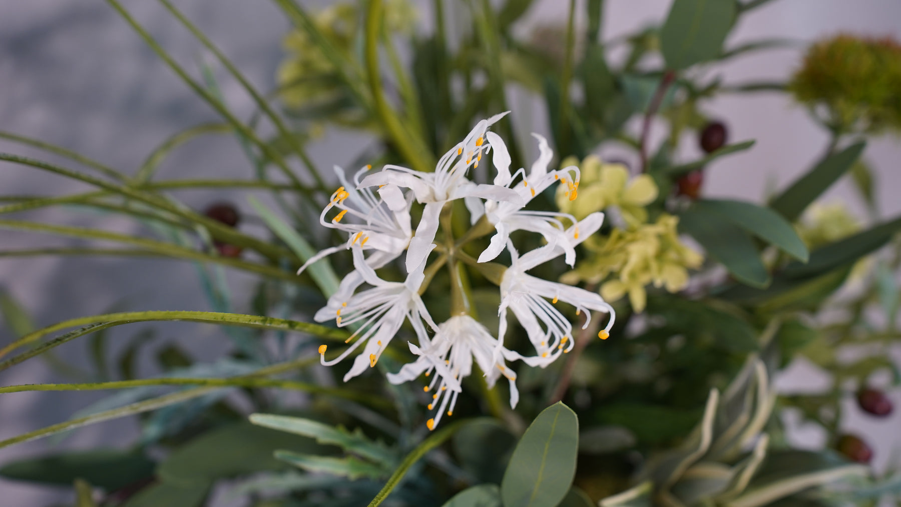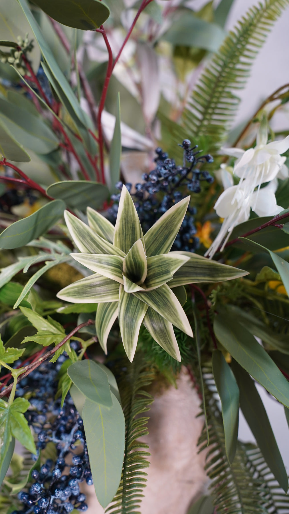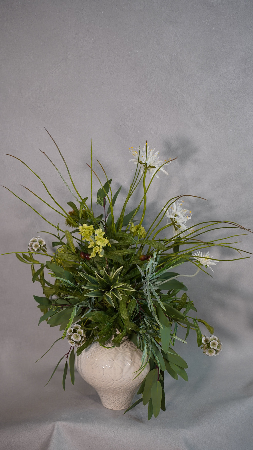 A layered mix of crisp greens and soft ivory creates a clean, modern look. Wispy white spider blooms float above sculptural foliage, with chartreuse accents and berry-like details adding depth. A variegated, succulent-style center gives the design a contemporary edge, while flowing greenery extends outward for movement and a “styled, not stuffed” silhouette.