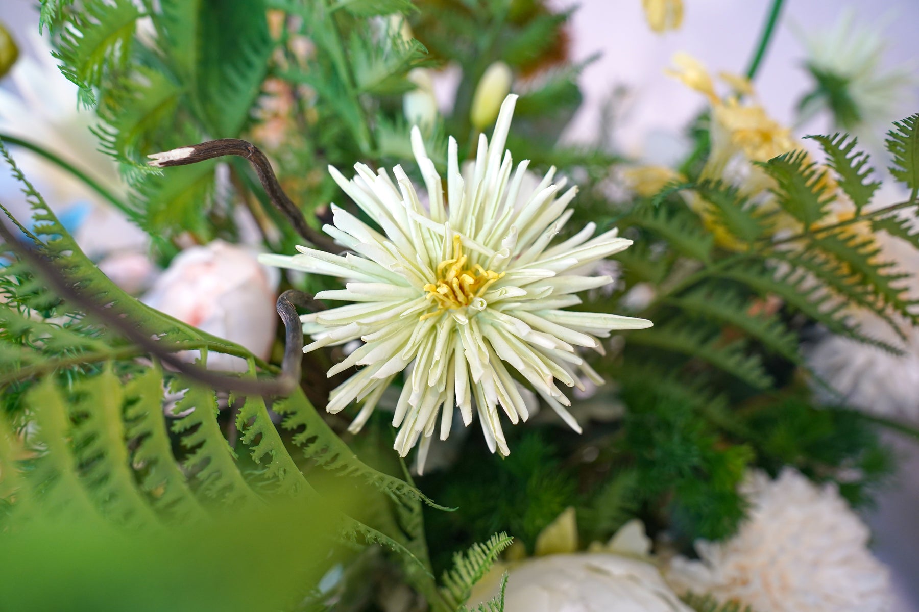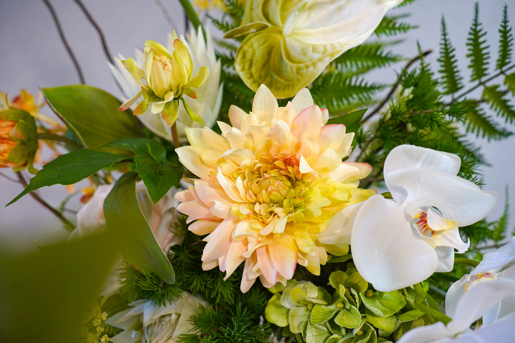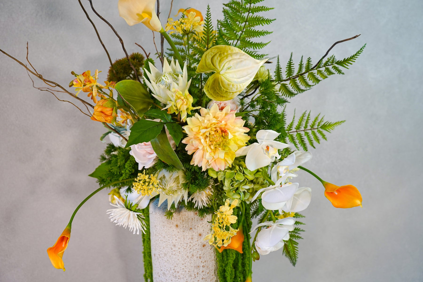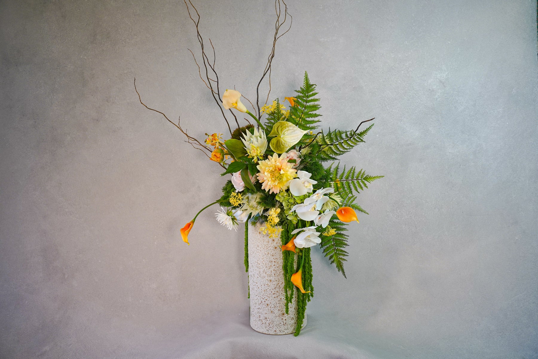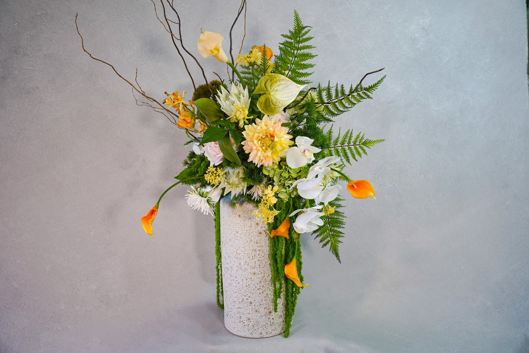 Crisp whites and soft creams set a clean, luxury base, warmed with buttery yellow and apricot accents. Sculptural white orchids take center stage, layered with cloud-like mums, airy spider blooms, and golden botanical sprigs. Fern fronds add lush fullness, while tall, twisting branches create height and a gallery-worthy silhouette. Finished with a dramatic cascade of mossy green for movement and softness.