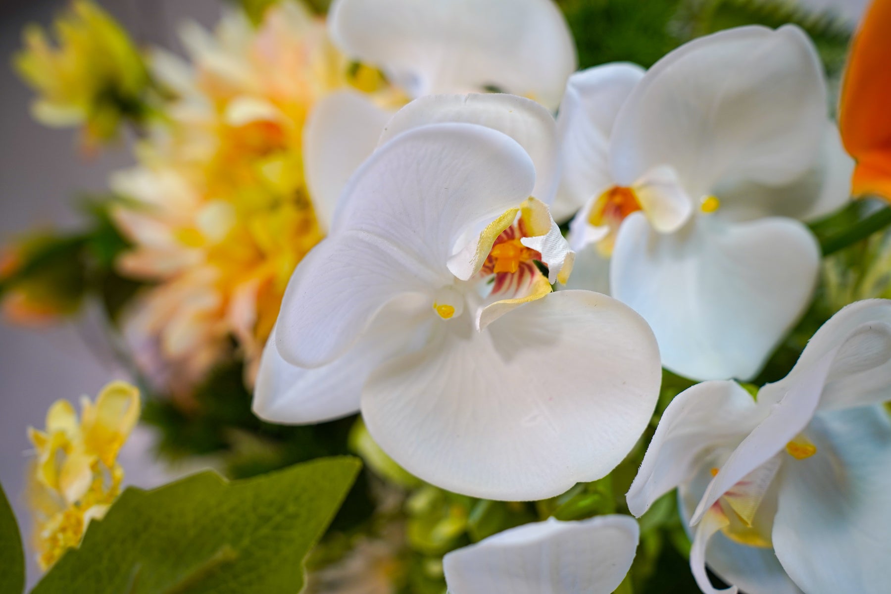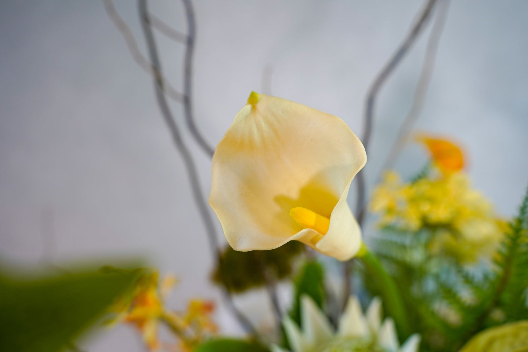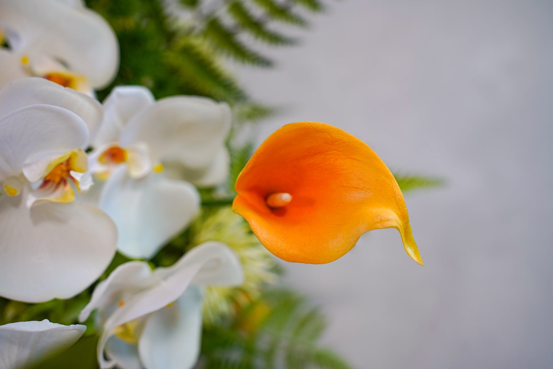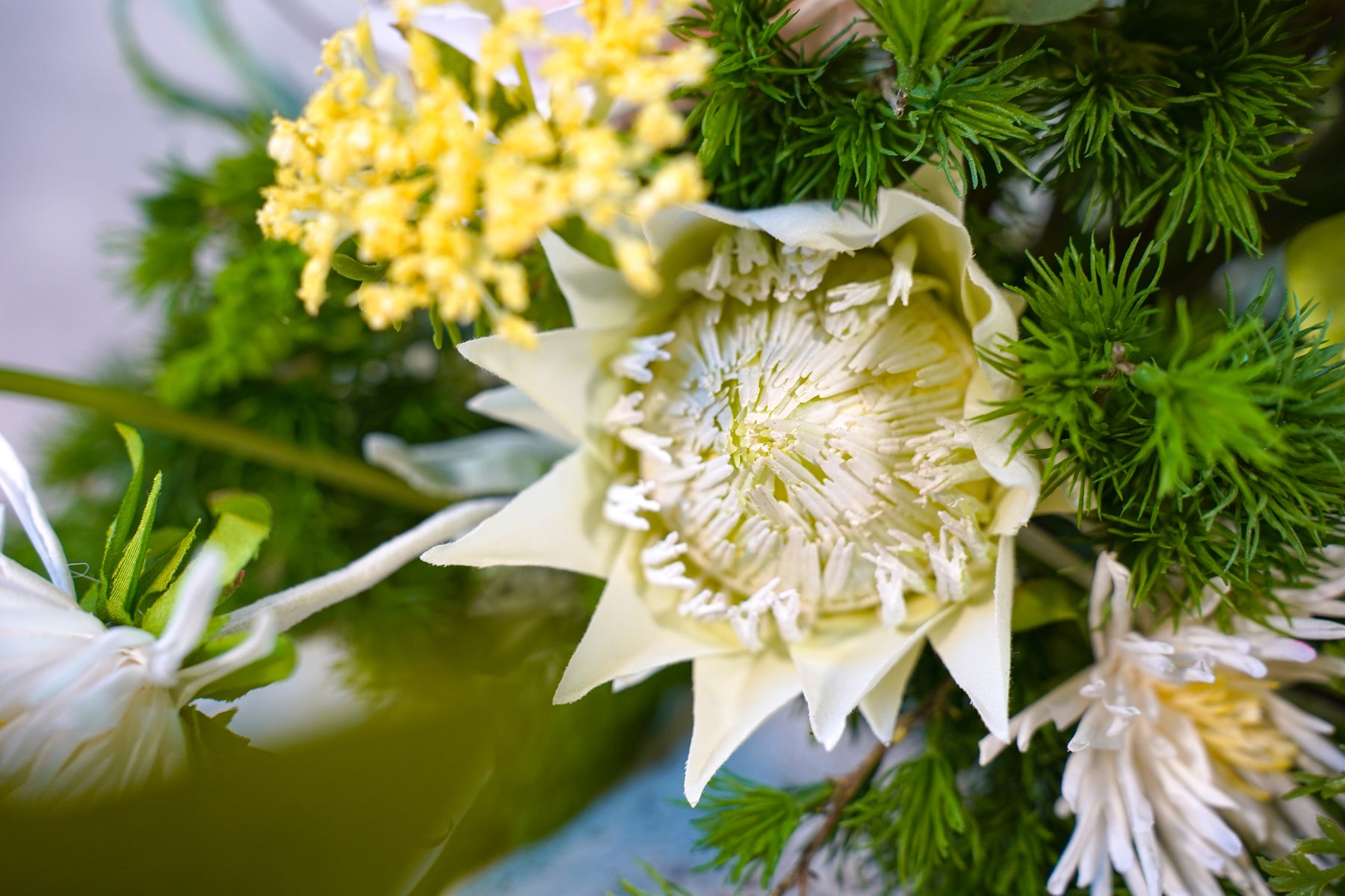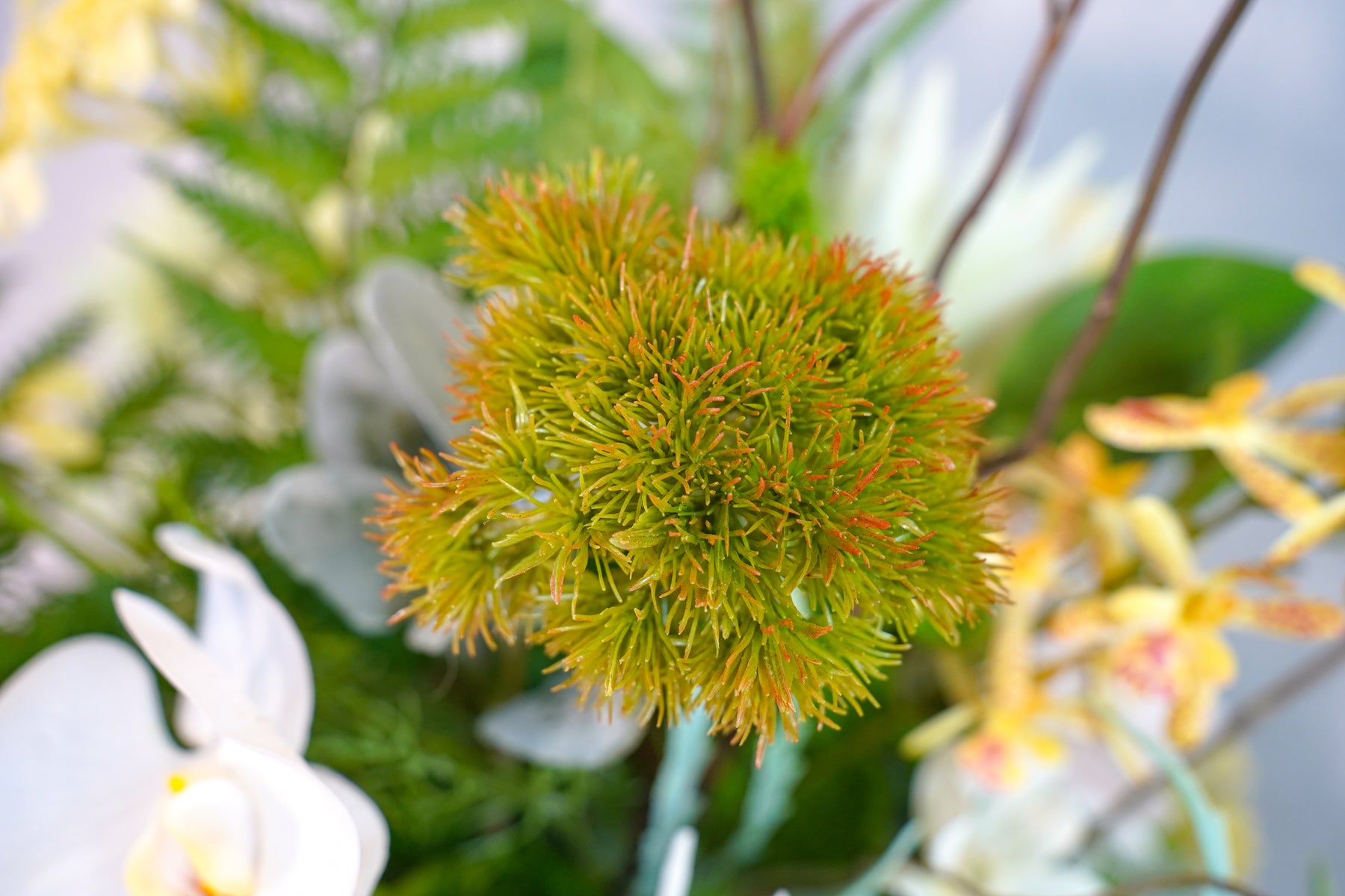 Crisp whites and soft creams set a clean, luxury base, warmed with buttery yellow and apricot accents. Sculptural white orchids take center stage, layered with cloud-like mums, airy spider blooms, and golden botanical sprigs. Fern fronds add lush fullness, while tall, twisting branches create height and a gallery-worthy silhouette. Finished with a dramatic cascade of mossy green for movement and softness.
