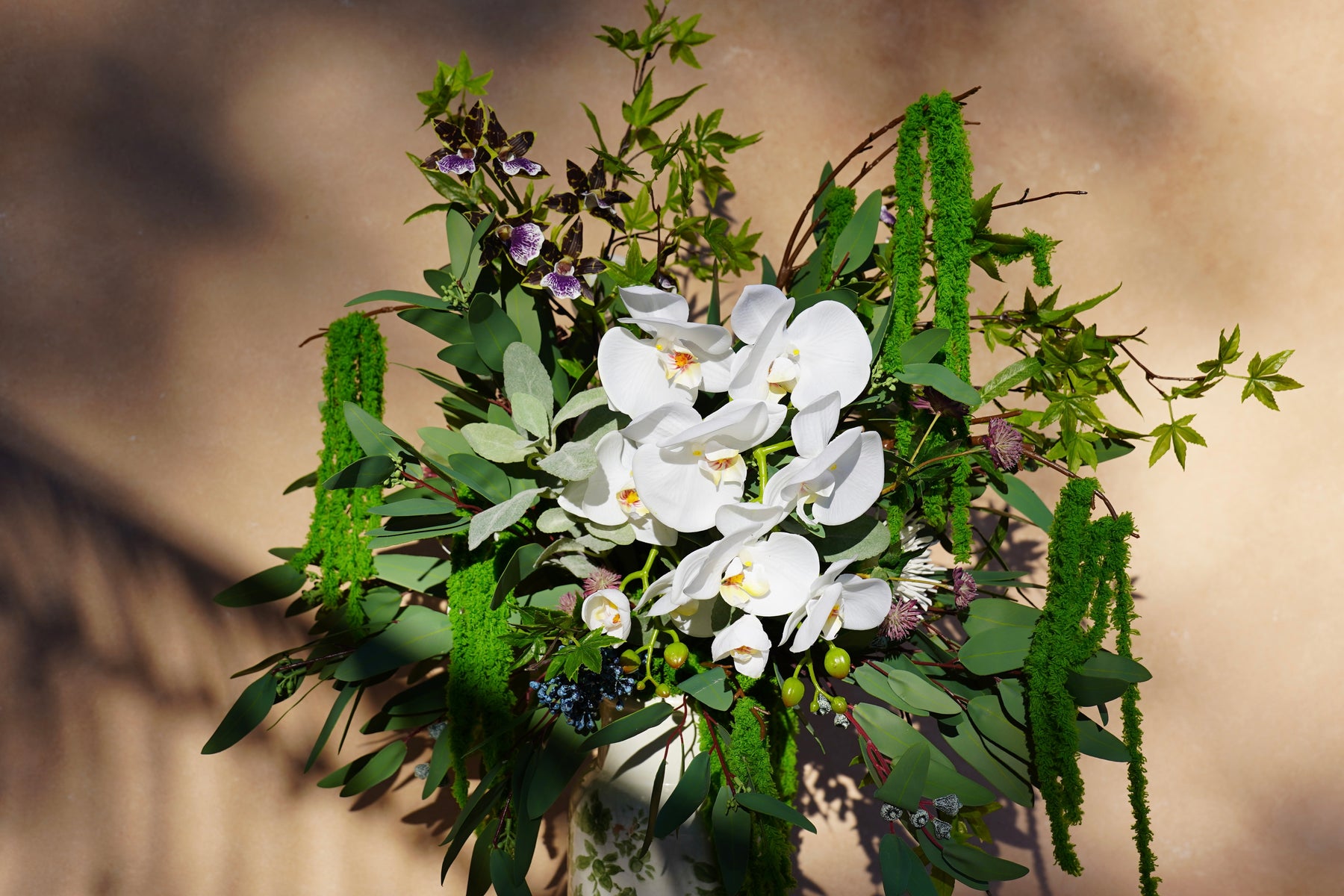 Crisp white orchids take center stage, floating through layers of deep green foliage and soft silvery leaves. Cascading, mossy-green strands create an elevated waterfall effect, while subtle berry accents and dark orchid notes add depth and intrigue. Airy branches lift the silhouette for a fresh, architectural finish that feels curated from every angle.