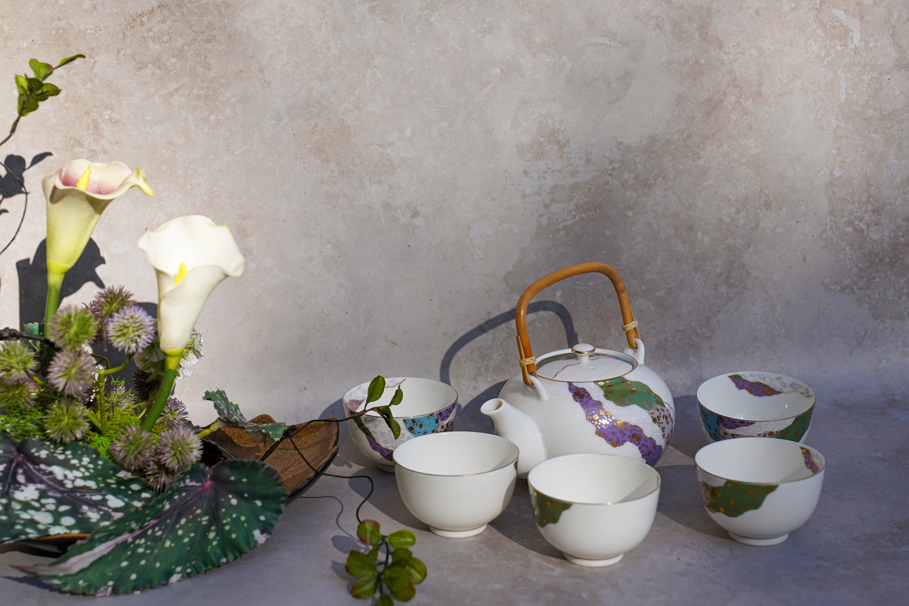 Keshiki no Utsuroi reflects the Japanese appreciation for subtle change, balance, and negative space. Rather than covering the surface with continuous ornament, this tea set allows areas of quiet porcelain to remain open—emphasizing contrast, restraint, and flow.